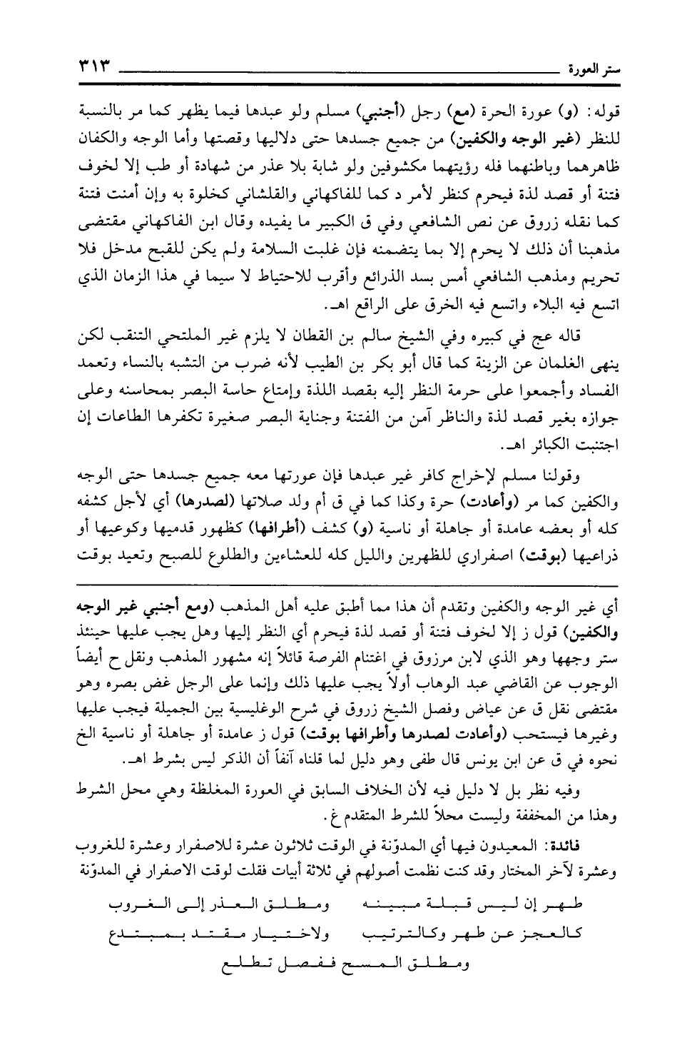 قوله: (و) عورة الحرة (مع) رجل (أجنبي) مسلم ولو عبدها فيما يظهر كما مر بالنسبة للنظر (غير الوجه والكفين) من جميع جسدها حتى دلاليها وقصتها وأما الوجه والكفان ظاهرهما وباطنهما فله رؤيتهما مكشوفين ولو شابة بلا عذر من شهادة أو طب إلا لخوف فتنة أو قصد لذة فيحرم كنظر لأمر د كما للفاكهاني والقلشاني كخلوة به وإن أمنت فتنة كما نقله زروق عن نص الشافعي وفي ق الكبير ما يفيده وقال ابن الفاكهاني مقتضى مذهبنا أن ذلك لا يحرم إلا بما يتضمنه فإن غلبت السلامة ولم يكن للقبح مدخل فلا تحريم ومذهب الشافعي أمس بسد الذرائع وأقرب للاحتياط لا سيما في هذا الزمان الذي اتسع فيه البلاء واتسع فيه الخرق على الراقع اهـ.