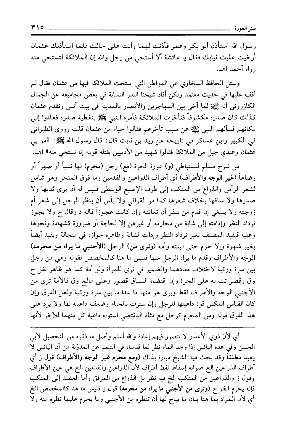 من شرح مسلم للسنباطي (و) عورة الحرة (مع) رجل (محرم) لها نسبًا أو صهرًا أو رضاعًا (غير الوجه والأطراف) أي أطراف الذراعين والقدمين وما فوق المنحر وهو شامل لشعر الرأس والذراع من المنكب إلى طرف الإصبع الوسطى فليس له أن يرى ثديها ولا صدرها ولا ساقها بخلاف شعرها كما مر القرافي ولا بأس أن ينظر الرجل إلى شعر أم زوجته ولا ينبغي إن قدم من سفر أن تعانقه وإن كانت عجوزًا قاله د وقال ح ولا يجوز ترداد النظر وإدامته إلى شابة من محارمه أو غيرهن إلا لحاجة أو ضرورة كشهادة ونحوها وعليه فيقيد المصنف بغير ترداد النظر وإدامته لشابة وظاهره جوازه في متجالة ويقيد أيضًا بغير شهوة وإلا حرم حتى لبنته وأمه (وترى من) الرجل (الأجنبي ما يراه من محرمه) الوجه والأطراف وقدم ما يراه الرجل منها فليس ما هنا كالمخصص لقوله وهي من رجل بين سرة وركبة لاختلاف مفادهما والضمير في ترى للمرأة ولو أمة كما هو ظاهر نقل ح وق وقصر تت له على الحرة وإن اقتضاه السياق قصور وعلى مالح وق فالأمة ترى من الأجنبي الوجه والأطراف فقط ويرى هو منها ما عدا ما بين سرة وركبة ولعل الفرق وإن كان القياس العكس قوة داعيتها للرجل وإن سترت بالحياء وضعف داعيته لها ولا يرد على هذا الفرق قوله ومن المحرم كرحل مع مثله المقتضي استواء داعية كل منهما للآخر لأنها