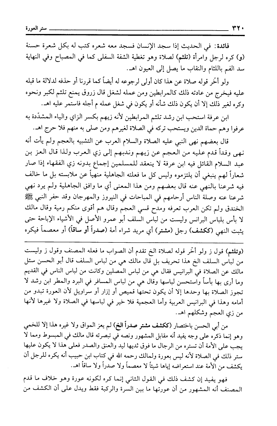 ابن عرفة استحب ابن رشد تلثم المرابطين لأنه زيهم بكسر الزاي والياء المشدّدة به عرفوا وهم حماة الدين ويستحب تركه في الصلاة لغيرهم ومن صلى به منهم فلا حرج اهـ.