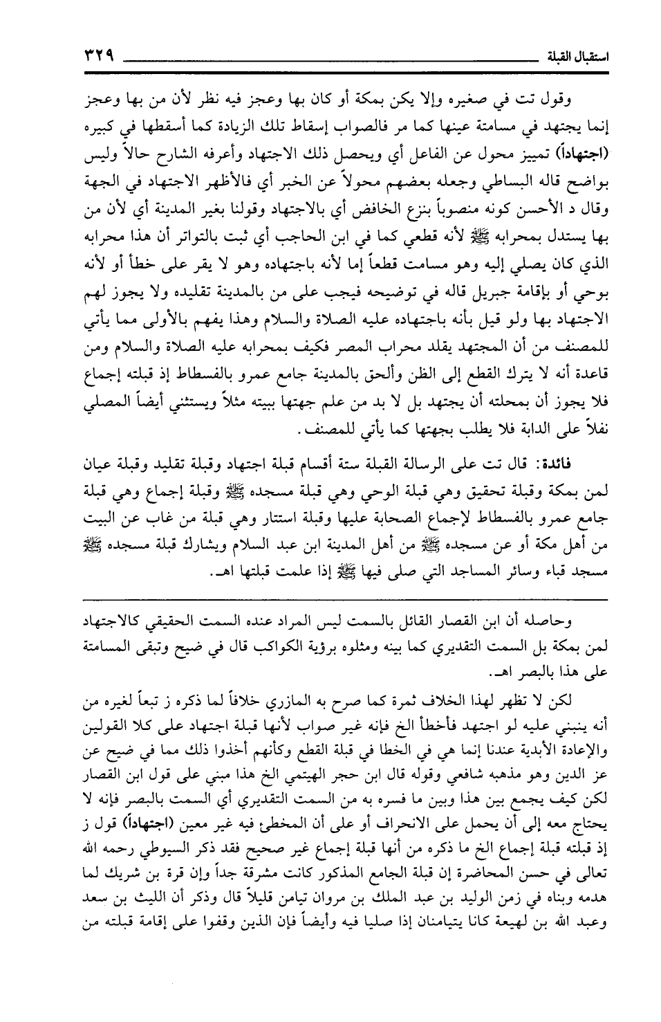 لكن لا تظهر لهذا الخلاف ثمرة كما صرح به المازري خلافًا لما ذكره ز تبعًا لغيره من أنه ينبني عليه لو اجتهد فأخطأ الخ فإنه غير صواب لأنها قبلة اجتهاد على كلا القولين والإعادة الأبدية عندنا إنما هي في الخطا في قبلة القطع وكأنهم أخذوا ذلك مما في ضيح عن عز الدين وهو مذهبه شافعي وقوله قال ابن حجر الهيتمي الخ هذا مبني على قول ابن القصار لكن كيف يجمع بين هذا وبين ما فسره به من السمت التقديري أي السمت بالبصر فإنه لا يحتاج معه إلى أن يحمل على الانحراف أو على أن المخطيء فيه غير معين (اجتهادًا) قول ز إذ قبلته قبلة إجماع الخ ما ذكره من أنها قبلة إجماع غير صحيح فقد ذكر السيوطي رحمه الله تعالى في حسن المحاضرة إن قبلة الجامع المذكور كانت مشرقة جدًّا وإن قرة بن شريك لما هدمه وبناه في زمن الوليد بن عبد الملك بن مروان تيامن قليلًا قال وذكر أن الليث بن سعد وعبد الله بن لهيعة كانا يتيامنان إذا صليا فيه وأيضًا فإن الذين وقفوا على إقامة قبلته من