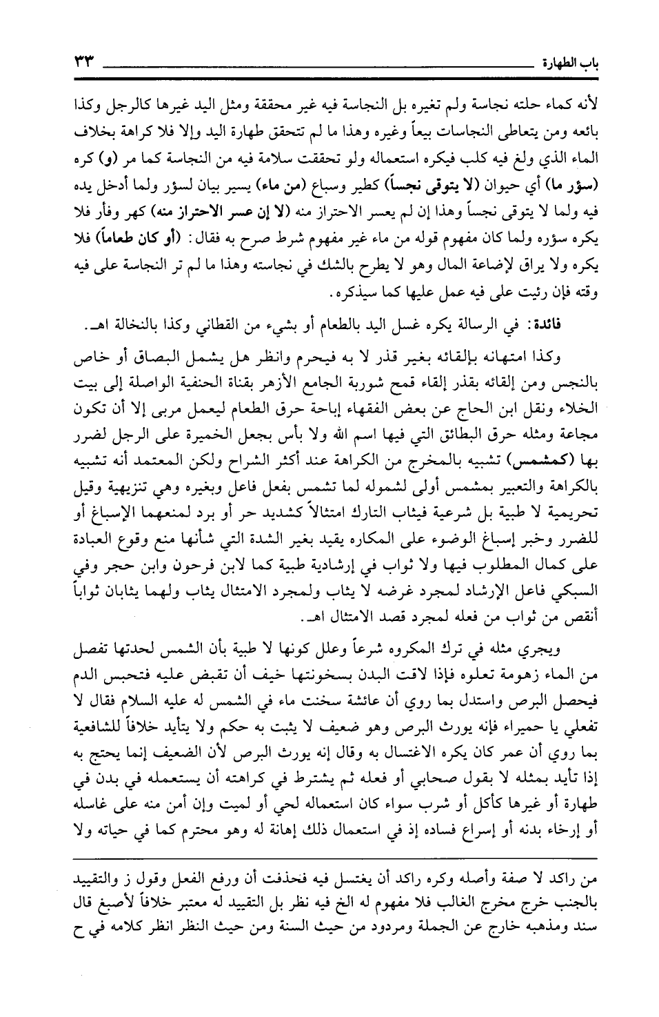 وكذا امتهانه بإلقائه بغير قذر لا به فيحرم وانظر هل يشمل البصاق أو خاص بالنجس ومن إلقائه بقذر إلقاء قمح شوربة الجامع الأزهر بقناة الحنفية الواصلة إلى بيت الخلاء ونقل ابن الحاج عن بعض الفقهاء إباحة حرق الطعام ليعمل مربى إلا أن تكون مجاعة ومثله حرق البطائق التي فيها اسم الله ولا بأس بجعل الخميرة على الرجل لضرر بها (كمشمس) تشبيه بالمخرج من الكراهة عند أكثر الشراح ولكن المعتمد أنه تشبيه بالكراهة والتعبير بمشمس أولى لشموله لما تشمس بفعل فاعل وبغيره وهي تنزيهية وقيل تحريمية لا طبية بل شرعية فيثاب التارك امتثالًا كشديد حر أو برد لمنعهما الإسباغ أو للضرر وخبر إسباغ الوضوء على المكاره يقيد بغير الشدة التي شأنها منع وقوع العبادة على كمال المطلوب فيها ولا ثواب في إرشادية طبية كما لابن فرحون وابن حجر وفي السبكي فاعل الإرشاد لمجرد غرضه لا يثاب ولمجرد الامتثال يثاب ولهما يثابان ثوابًا أنقص من ثواب من فعله لمجرد قصد الامتثال اهـ.