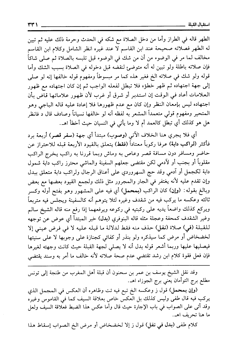 أي فلا يجري هنا الخلاف الآتي (وصوب) مبتدأ أي جهة (سفر قصر) أربعة برد فأكثر (لراكب دابة) عرفا ركوبًا معتادًا (فقط) يتعلق بالقيود الأربعة قبله للاحتراز عن حاضر ومسافر دون مسافة قصر وعاص به وماش وبما قررنا به راكب يخرج الراكب مقلوبًا أو بجنب أو لآدمي لكن مقتضى جعلهم السفينة والماشي محترز راكب دابة شمول دابة لكجمل أو آدمي وقد حج السهروردي على أعناق الرجال ولراكب دابة متعلق ببدل وإن تقدم عليه لأنه يغتفر في الجار والمجرور مثل ذلك ولجمع القيود بعضها مع بعض وبالغ بقوله: (وإن) كان الراكب (بمحمل) أي فيه على المشهور وهو بفتح أوله وكسر ثالثه وعكسه ما يركب فيه من شقدف وغيره لئلا يتوهم أنه كالسفينة ويجلس فيه متربعًا ويركع كذلك واضعًا يديه على ركبتيه في ركوعه ويرفعهما إذا رفع منه قاله الشيخ سالم وغير الشقدف كمحفة وعجلة مثله قاله البنوفري (بدل) خبر المبتدأ أي عوض عن توجهه للقبلة (في) صلاة (نفل) حذف منه فقط لدلالة ما قبله عليه لا في فرض عيني إلا لخضخاض أو مرض كما سيذكره ولو بنذر أو كفائي كجنازة على وجوبها لا على سنيتها فيصليها عليها وربما أشعر قوله بدل أنه لا يصلي لجهة القبلة حيث كانت وجهته لغيرها فإن فعل فقوة كلام ابن رشد تقتضي عدم صحة صلاته لأنه خالف ما أمر به وسند يقتضي