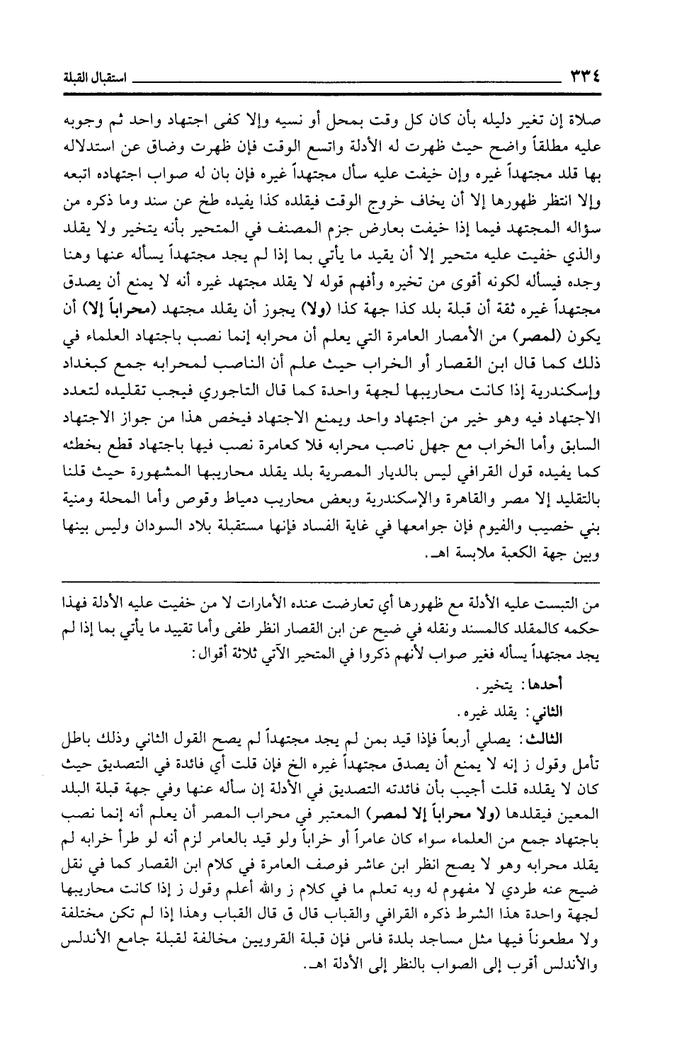 صلاة إن تغير دليله بأن كان كل وقت بمحل أو نسيه وإلا كفى اجتهاد واحد ثم وجوبه عليه مطلقًا واضح حيث ظهرت له الأدلة واتسع الوقت فإن ظهرت وضاق عن استدلاله بها قلد مجتهدًا غيره وإن خيفت عليه سأل مجتهدًا غيره فإن بان له صواب اجتهاده اتبعه وإلا انتظر ظهورها إلا أن يخاف خروج الوقت فيقلده كذا يفيده طخ عن سند وما ذكره من سؤاله المجتهد فيما إذا خيفت بعارض جزم المصنف في المتحير بأنه يتخير ولا يقلد والذي خفيت عليه متحير إلا أن يقيد ما يأتي بما إذا لم يجد مجتهدًا يسأله عنها وهنا وجده فيسأله لكونه أقوى من تخيره وأفهم قوله لا يقلد مجتهد غيره أنه لا يمنع أن يصدق مجتهدًا غيره ثقة أن قبلة بلد كذا جهة كذا (ولا) يجوز أن يقلد مجتهد (محرابًا إلا) أن يكون (لمصر) من الأمصار العامرة التي يعلم أن محرابه إنما نصب باجتهاد العلماء في ذلك كما قال ابن القصار أو الخراب حيث علم أن الناصب لمحرابه جمع كبغداد وإسكندرية إذا كانت محاريبها لجهة واحدة كما قال التاجوري فيجب تقليده لتعدد الاجتهاد فيه وهو خير من اجتهاد واحد ويمنع الاجتهاد فيخص هذا من جواز الاجتهاد السابق وأما الخراب مع جهل ناصب محرابه فلا كعامرة نصب فيها باجتهاد قطع بخطئه كما يفيده قول القرافي ليس بالديار المصرية بلد يقلد محاريبها المشهورة حيث قلنا بالتقليد إلا مصر والقاهرة والإسكندرية وبعض محاريب دمياط وقوص وأما المحلة ومنية بني خصيب والفيوم فإن جوامعها في غاية الفساد فإنها مستقبلة بلاد السودان وليس بينها وبين جهة الكعبة ملابسة اهـ.