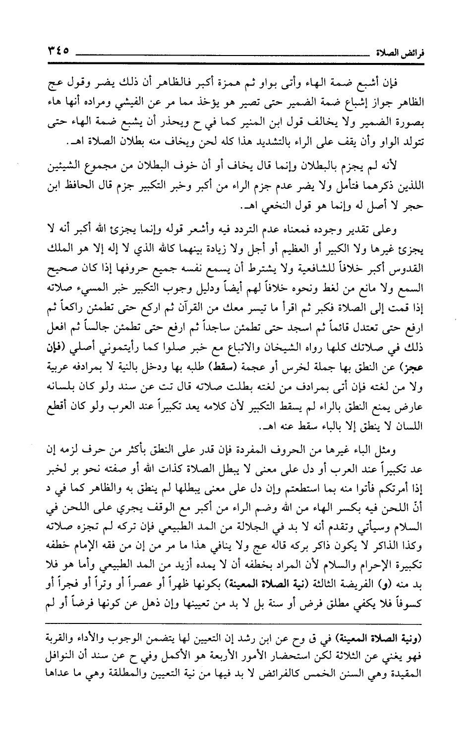 ومثل الباء غيرها من الحروف المفردة فإن قدر على النطق بأكثر من حرف لزمه إن عد تكبيرًا عند العرب أو دل على معنى لا يبطل الصلاة كذات الله أو صفته نحو بر لخبر إذا أمرتكم فأتوا منه بما استطعتم وإن دل على معنى يبطلها لم ينطق به والظاهر كما في د أنّ اللحن فيه بكسر الهاء من الله وضم الراء من أكبر مع الوقف يجري على اللحن في السلام وسيأتي وتقدم أنه لا بد في الجلالة من المد الطبيعي فإن تركه لم تجزه صلاته وكذا الذاكر لا يكون ذاكر بركه قاله عج ولا ينافي هذا ما مر من إن من فقه الإمام خطفه تكبيرة الإحرام والسلام لأن المراد بخطفه أن لا يمده أزيد من المد الطبيعي وأما هو فلا بد منه (و) الفريضة الثالثة (نية الصلاة المعينة) بكونها ظهرًا أو عصرًا أو وترًا أو فجرًا أو كسوفًا فلا يكفي مطلق فرض أو سنة بل لا بد من تعيينها وإن ذهل عن كونها فرضًا أو لم