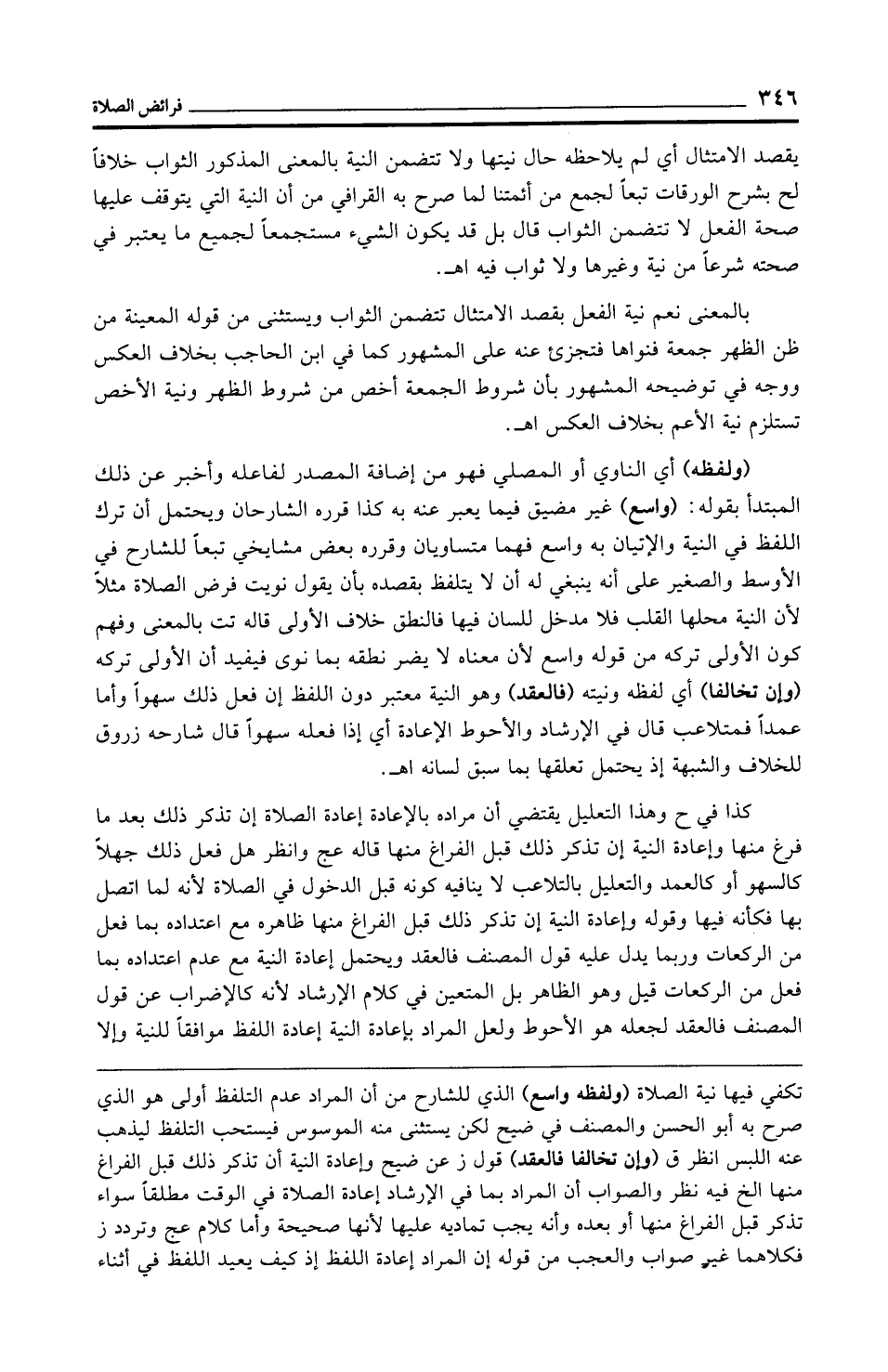 تكفي فيها نية الصلاة (ولفظه واسع) الذي للشارح من أن المراد عدم التلفظ أولى هو الذي صرح به أبو الحسن والمصنف في ضيح لكن يستثنى منه الموسوس فيستحب التلفظ ليذهب عنه اللبس انظر ق (وإن تخالفا فالعقد) قول ز عن ضيح إعادة النية أن تذكر ذلك قبل الفراغ منها الخ فيه نظر والصواب أن المراد بما في الإرشاد إعادة الصلاة في الوقت مطلقًا سواء تذكر قبل الفراغ منها أو بعده وأنه يجب تماديه عليها لأنها صحيحة وأما كلام عج وتردد ز فكلاهما غير صواب والعجب من قوله إن المراد إعادة اللفظ إذ كيف يعيد اللفظ في أثناء
