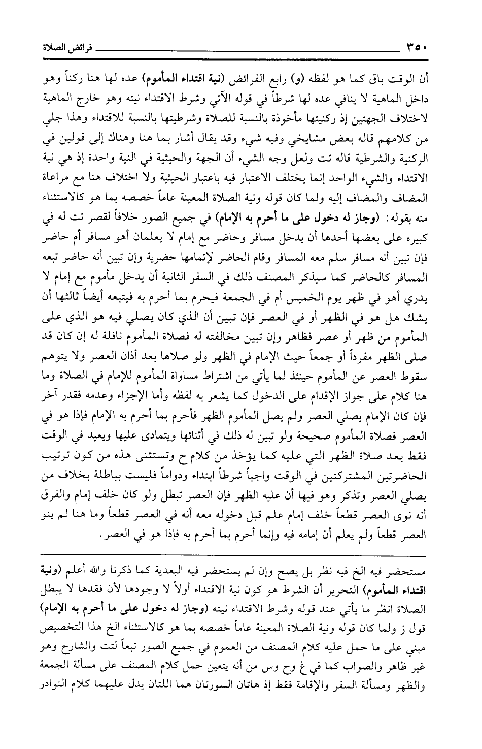 أن الوقت باق كما هو لفظه (و) رابع الفرائض (نية اقتداء المأموم) عده لها هنا ركنًا وهو داخل الماهية لا ينافي عده لها شرطًا في قوله الآتي وشرط الاقتداء نيته وهو خارج الماهية لاختلاف الجهتين إذ ركنيتها مأخوذة بالنسبة للصلاة وشرطيتها بالنسبة للاقتداء وهذا جلي من كلامهم قاله بعض مشايخي وفيه شيء وقد يقال أشار بما هنا وهناك إلى قولين في الركنية والشرطية قاله تت ولعل وجه الشيء أن الجهة والحيثية في النية واحدة إذ هي نية الاقتداء والشيء الواحد إنما يختلف الاعتبار فيه باعتبار الحيثية ولا اختلاف هنا مع مراعاة المضاف والمضاف إليه ولما كان قوله ونية الصلاة المعينة عامًّا خصصه بما هو كالاستثناء منه بقوله: (وجاز له دخول على ما أحرم به الإمام) في جميع الصور خلافًا لقصر تت له في كبيره على بعضها أحدها أن يدخل مسافر وحاضر مع إمام لا يعلمان أهو مسافر أم حاضر فإن تبين أنه مسافر سلم معه المسافر وقام الحاضر لإتمامها حضرية وإن تبين أنه حاضر تبعه المسافر كالحاضر كما سيذكر المصنف ذلك في السفر الثانية أن يدخل مأموم مع إمام لا يدري أهو في ظهر يوم الخميس أم في الجمعة فيحرم بما أحرم به فيتبعه أيضًا ثالثها أن يشك هل هو في الظهر أو في العصر فإن تبين أن الذي كان يصلي فيه هو الذي على المأموم من ظهر أو عصر فظاهر وإن تبين مخالفته له فصلاة المأموم نافلة له إن كان قد صلى الظهر مفردًا أو جمعًا حيث الإمام في الظهر ولو صلاها بعد أذان العصر ولا يتوهم سقوط العصر عن المأموم حينئذ لما يأتي من اشتراط مساواة المأموم للإمام في الصلاة وما هنا كلام على جواز الإقدام على الدخول كما يشعر به لفظه وأما الإجزاء وعدمه فقدر آخر فإن كان الإمام يصلي العصر ولم يصل المأموم الظهر فأحرم بما أحرم به الإمام فإذا هو في العصر فصلاة المأموم صحيحة ولو تبين له ذلك في أثنائها ويتمادى عليها ويعيد في الوقت فقط بعد صلاة الظهر التي عليه كما يؤخذ من كلام ح وتستثنى هذه من كون ترتيب الحاضرتين المشتركتين في الوقت واجبًا شرطًا ابتداء ودوامًا فليست بباطلة بخلاف من يصلي العصر وتذكر وهو فيها أن عليه الظهر فإن العصر تبطل ولو كان خلف إمام والفرق أنه نوى العصر قطعًا خلف إمام علم قبل دخوله معه أنه في العصر قطعًا وما هنا لم ينو العصر قطعًا ولم يعلم أن إمامه فيه وإنما أحرم بما أحرم به فإذا هو في العصر.