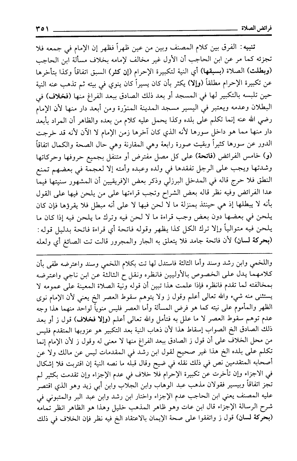 تنبيه: الفرق بين كلام المصنف وبين من عين ظهرًا فظهر إن الإمام في جمعه فلا تجزئه كما مر عن ابن الحاجب أن الأول غير مخالف لإمامه بخلاف مسألة ابن الحاجب (وبطلت) الصلاة (بسبقها) أي النية لتكبيرة الإحرام (إن كثر) السبق اتفاقًا وكذا بتأخرها عن تكبيرة الإحرام مطلقًا (وإلا) يكثر بأن كان يسيرًا كان ينوي في بيته ثم تذهب عنه النية حين تلبسه بالتكبير لها في المسجد أو بعد ذلك الصادق ببعد الفراغ منها (فخلاف) في البطلان وعدمه ويعتبر في اليسير مسجد المدينة المنوّرة ومن أبعد دار منها لأن الإمام رضي الله عنه إنما تكلم على بلده وكذا يحمل عليه كلام من بعده والظاهر أن المراد بأبعد دار منها مما هو داخل سورها لأنه الذي كان آخرها زمن الإمام لا الآن لأنه قد خرجت الدور عن سورها كثيرًا وبقيت صورة رابعة وهي المقارنة وهي حال الصحة والكمال اتفاقًا (و) خامس الفرائض (فاتحة) على كل فصل مفترض أو متنفل بجميع حروفها وحركاتها وشدتها ويجب على الرجل تفقدها في ولده وعبده وأمته إلا لعجمة في بعضهم تمنع النطق فلا حرج قاله في المدخل البرزلي وذكر بعض الإفريقيين أن المشهور سنيتها فيما عدا الفرائض وفيه نظر قاله بعض الشراح وتجب قراءتها على من يلحن فيها على القول بأنه لا يبطلها إذ هي حينئذ بمنزلة ما لا لحن فيها لا على أنه مبطل فلا يقرؤها فإن كان يلحن في بعضها دون بعض وجب قراءة ما لا لحن فيه وترك ما يلحن فيه إذا كان ما يلحن فيه متواليًا وإلا ترك الكل كذا يظهر وقوله فاتحة أي قراءة فاتحة بدليل قوله: (بحركة لسان) لأن فاتحة جامد فلا يتعلق به الجار والمجرور قالت تت الصائغ أي ولعله