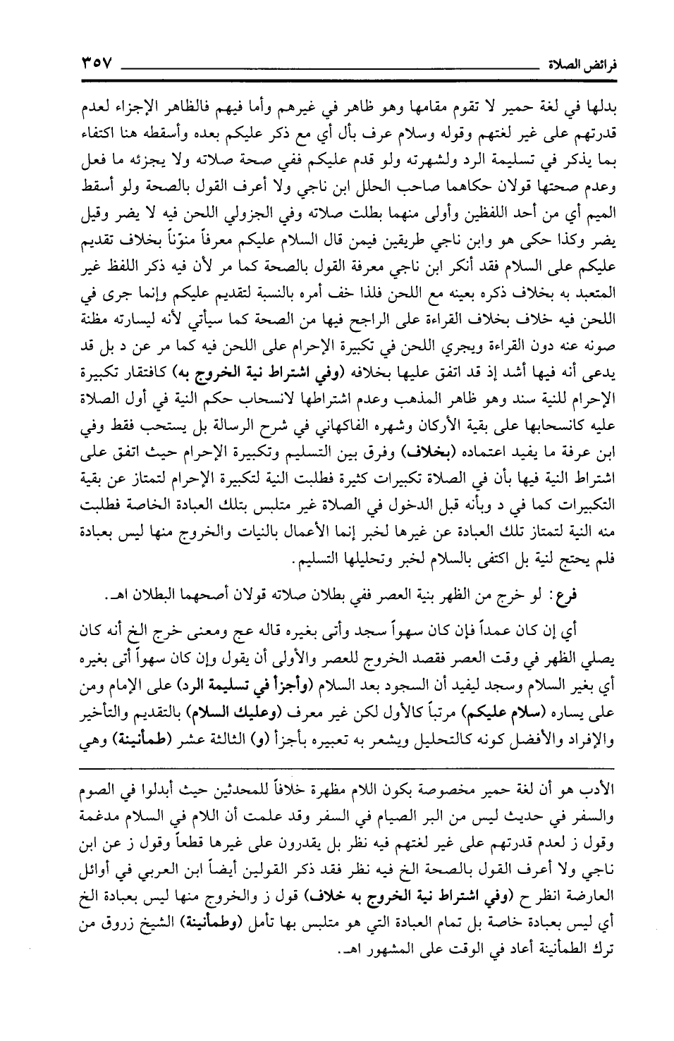 الأدب هو أن لغة حمير مخصوصة بكون اللام مظهرة خلافًا للمحدثين حيث أبدلوا في الصوم والسفر في حديث ليس من البر الصيام في السفر وقد علمت أن اللام في السلام مدغمة وقول ز لعدم قدرتهم على غير لغتهم فيه نظر بل يقدرون على غيرها قطعًا وقول ز عن ابن ناجي ولا أعرف القول بالصحة الخ فيه نظر فقد ذكر القولين أيضًا ابن العربي في أوائل العارضة انظر ح (وفي اشتراط نية الخروج به خلاف) قول ز والخروج منها ليس بعبادة الخ أي ليس بعبادة خاصة بل تمام العبادة التي هو متلبس بها تأمل (وطمأنينة) الشيخ زروق من ترك الطمأنينة أعاد في الوقت على المشهور اهـ.