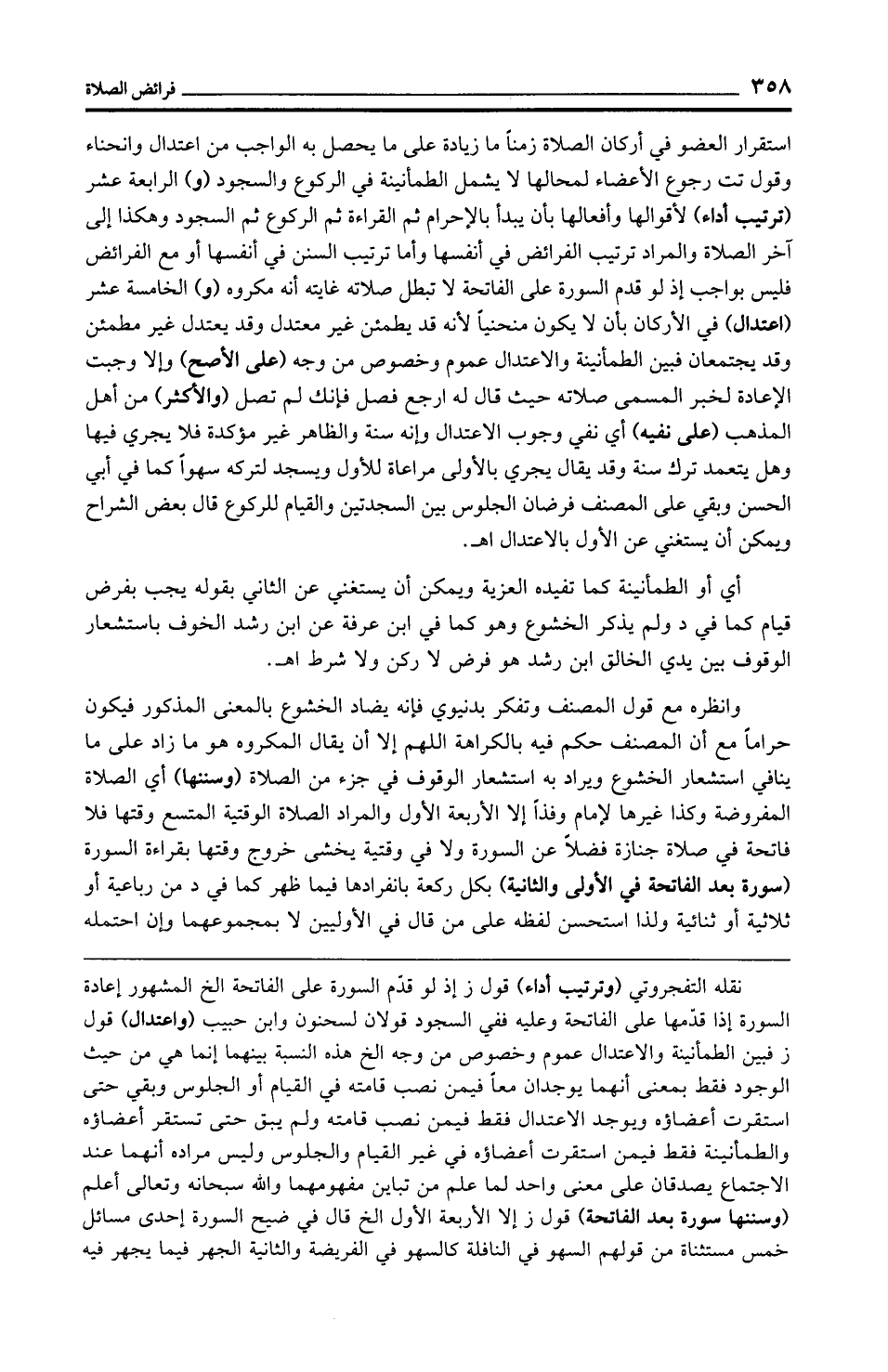 استقرار العضو في أركان الصلاة زمنًا ما زيادة على ما يحصل به الواجب من اعتدال وانحناء وقول تت رجوع الأعضاء لمحالها لا يشمل الطمأنينة في الركوع والسجود (و) الرابعة عشر (ترتيب أداء) لأقوالها وأفعالها بأن يبدأ بالإحرام ثم القراءة ثم الركوع ثم السجود وهكذا إلى آخر الصلاة والمراد ترتيب الفرائض في أنفسها وأما ترتيب السنن في أنفسها أو مع الفرائض فليس بواجب إذ لو قدم السورة على الفاتحة لا تبطل صلاته غايته أنه مكروه (و) الخامسة عشر (اعتدال) في الأركان بأن لا يكون منحنيًا لأنه قد يطمئن غير معتدل وقد يعتدل غير مطمئن وقد يجتمعان فبين الطمأنينة والاعتدال عموم وخصوص من وجه (على الأصح) وإلا وجبت الإعادة لخبر المسمى صلاته حيث قال له ارجع فصل فإنك لم تصل (والأكثر) من أهل المذهب (على نفيه) أي نفي وجوب الاعتدال وإنه سنة والظاهر غير مؤكدة فلا يجري فيها وهل يتعمد ترك سنة وقد يقال يجري بالأولى مراعاة للأول ويسجد لتركه سهوًا كما في أبي الحسن وبقي على المصنف فرضان الجلوس بين السجدتين والقيام للركوع قال بعض الشراح ويمكن أن يستغني عن الأول بالاعتدال اهـ.