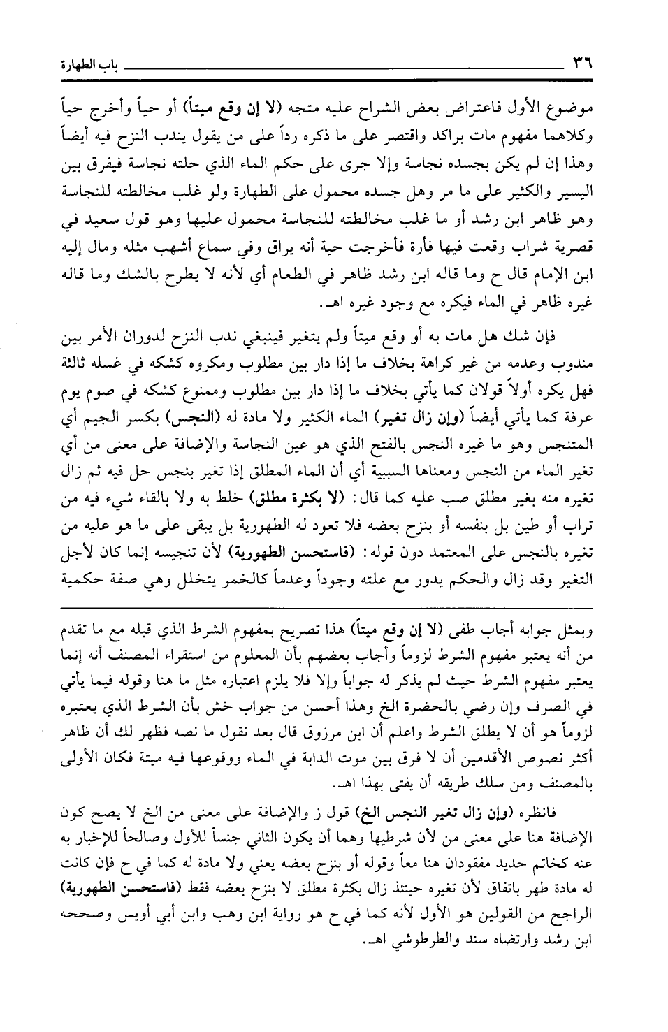 وبمثل جوابه أجاب طفى (لا إن وقع ميتًا) هذا تصريح بمفهوم الشرط الذي قبله مع ما تقدم من أنه يعتبر مفهوم الشرط لزومًا وأجاب بعضهم بأن المعلوم من استقراء المصنف أنه إنما يعتبر مفهوم الشرط حيث لم يذكر له جوابًا وإلا فلا يلزم اعتباره مثل ما هنا وقوله فيما يأتي في الصرف وإن رضي بالحضرة الخ وهذا أحسن من جواب خش بأن الشرط الذي يعتبره لزومًا هو أن لا يطلق الشرط واعلم أن ابن مرزوق قال بعد نقول ما نصه فظهر لك أن ظاهر أكثر نصوص الأقدمين أن لا فرق بين موت الدابة في الماء ووقوعها فيه ميتة فكان الأولى بالمصنف ومن سلك طريقه أن يفتى بهذا اهـ.