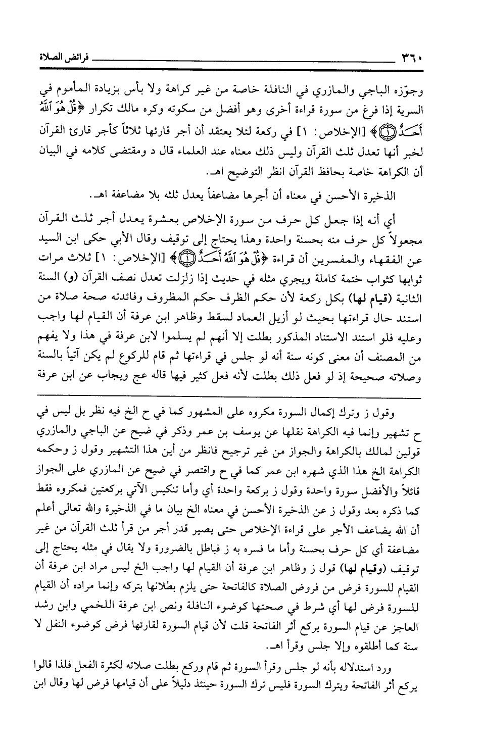 وقول ز وترك إكمال السورة مكروه على المشهور كما في ح الخ فيه نظر بل ليس في ح تشهير وإنما فيه الكراهة نقلها عن يوسف بن عمر وذكر في ضيح عن الباجي والمازري قولين لمالك بالكراهة والجواز من غير ترجيح فانظر من أين هذا التشهير وقول ز وحكمه الكراهة الخ هذا الذي شهره ابن عمر كما في ح واقتصر في ضيح عن المازري على الجواز قائلًا والأفضل سورة واحدة وقول ز بركعة واحدة أي وأما تنكيس الآتي بركعتين فمكروه فقط كما ذكره بعد وقول ز عن الذخيرة الأحسن في معناه الخ بيان ما في الذخيرة والله تعالى أعلم أن الله يضاعف الأجر على قراءة الإخلاص حتى يصير قدر أجر من قرأ ثلث القرآن من غير مضاعفة أي كل حرف بحسنة وأما ما فسره به ز فباطل بالضرورة ولا يقال في مثله يحتاج إلى توقيف (وقيام لها) قول ز وظاهر ابن عرفة أن القيام لها واجب الخ ليس مراد ابن عرفة أن القيام للسورة فرض من فروض الصلاة كالفاتحة حتى يلزم بطلانها بتركه وإنما مراده أن القيام للسورة فرض لها أي شرط في صحتها كوضوء النافلة ونص ابن عرفة اللخمي وابن رشد العاجز عن قيام السورة يركع أثر الفاتحة قلت لأن قيام السورة لقارئها فرض كوضوء النفل لا سنة كما أطلقوه وإلا جلس وقرأ اهـ.