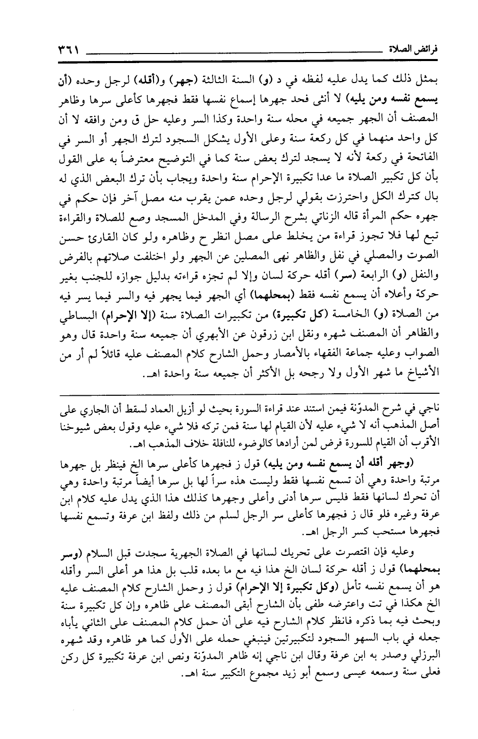 (وجهر أقله أن يسمع نفسه ومن يليه) قول ز فجهرها كأعلى سرها الشيخ فينظر بل جهرها مرتبة واحدة وهي أن تسمع نفسها فقط وليست هذه سرًّا لها بل سرها أيضًا مرتبة واحدة وهي أن تحرك لسانها فقط فليس سرها أدنى وأعلى وجهرها كذلك هذا الذي يدل عليه كلام ابن عرفة وغيره فلو قال ز فجهرها كأعلى سر الرجل لسلم من ذلك ولفظ ابن عرفة وتسمع نفسها فجهرها مستحب كسر الرجل اهـ.