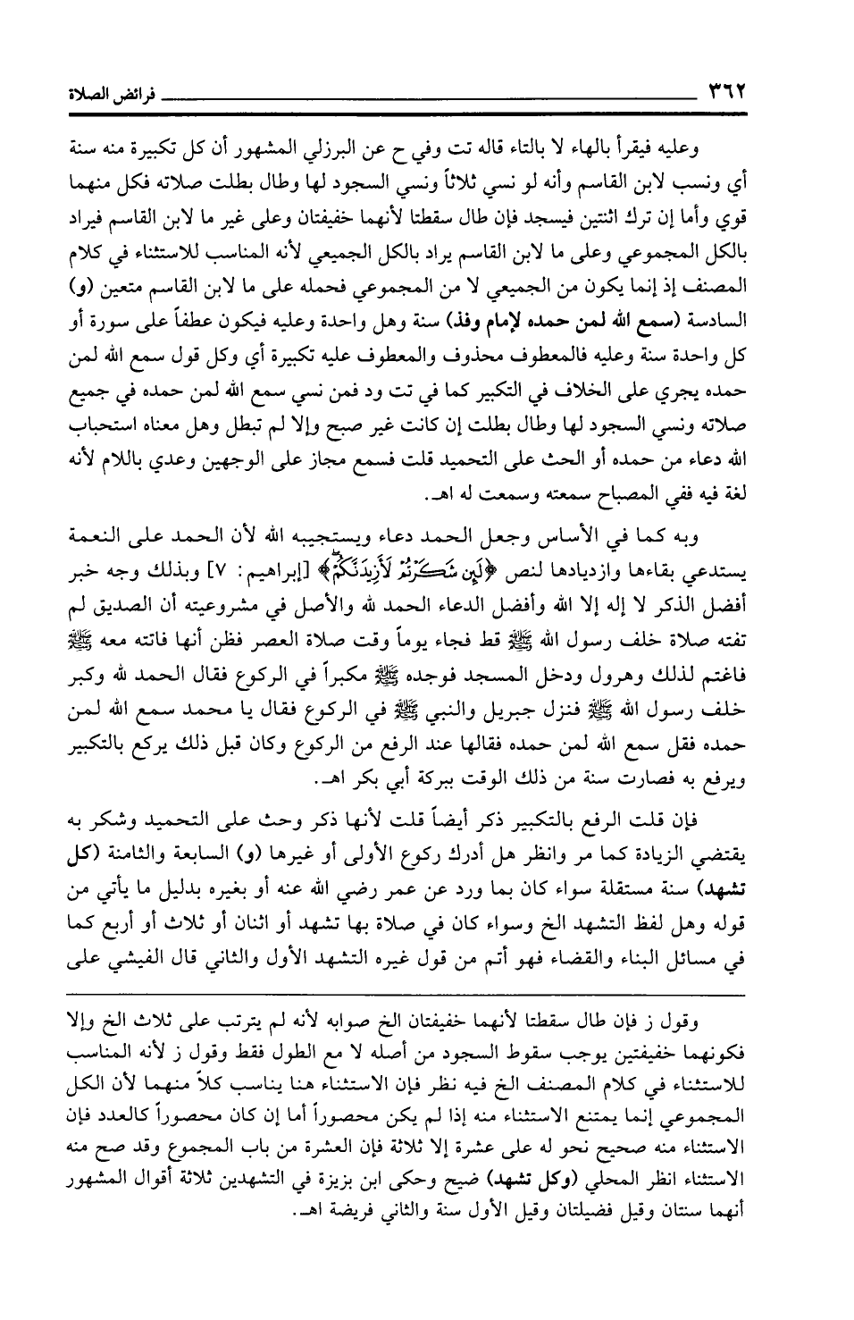 وعليه فيقرأ بالهاء لا بالتاء قاله تت وفي ح عن البرزلي المشهور أن كل تكبيرة منه سنة أي ونسب لابن القاسم وأنه لو نسي ثلاثًا ونسي السجود لها وطال بطلت صلاته فكل منهما قوي وأما إن ترك اثنتين فيسجد فإن طال سقطتا لأنهما خفيفتان وعلى غير ما لابن القاسم فيراد بالكل المجموعي وعلى ما لابن القاسم يراد بالكل الجميعي لأنه المناسب للاستثناء في كلام المصنف إذ إنما يكون من الجميعي لا من المجموعي فحمله على ما لابن القاسم متعين (و) السادسة (سمع الله لمن حمده لإمام وفذ) سنة وهل واحدة وعليه فيكون عطفًا على سورة أو كل واحدة سنة وعليه فالمعطوف محذوف والمعطوف عليه تكبيرة أي وكل قول سمع الله لمن حمده يجري على الخلاف في التكبير كما في تت ود فمن نسي سمع الله لمن حمده في جميع صلاته ونسي السجود لها وطال بطلت إن كانت غير صبح وإلا لم تبطل وهل معناه استحباب الله دعاء من حمده أو الحث على التحميد قلت فسمع مجاز على الوجهين وعدي باللام لأنه لغة فيه ففي المصباح سمعته وسمعت له اهـ.