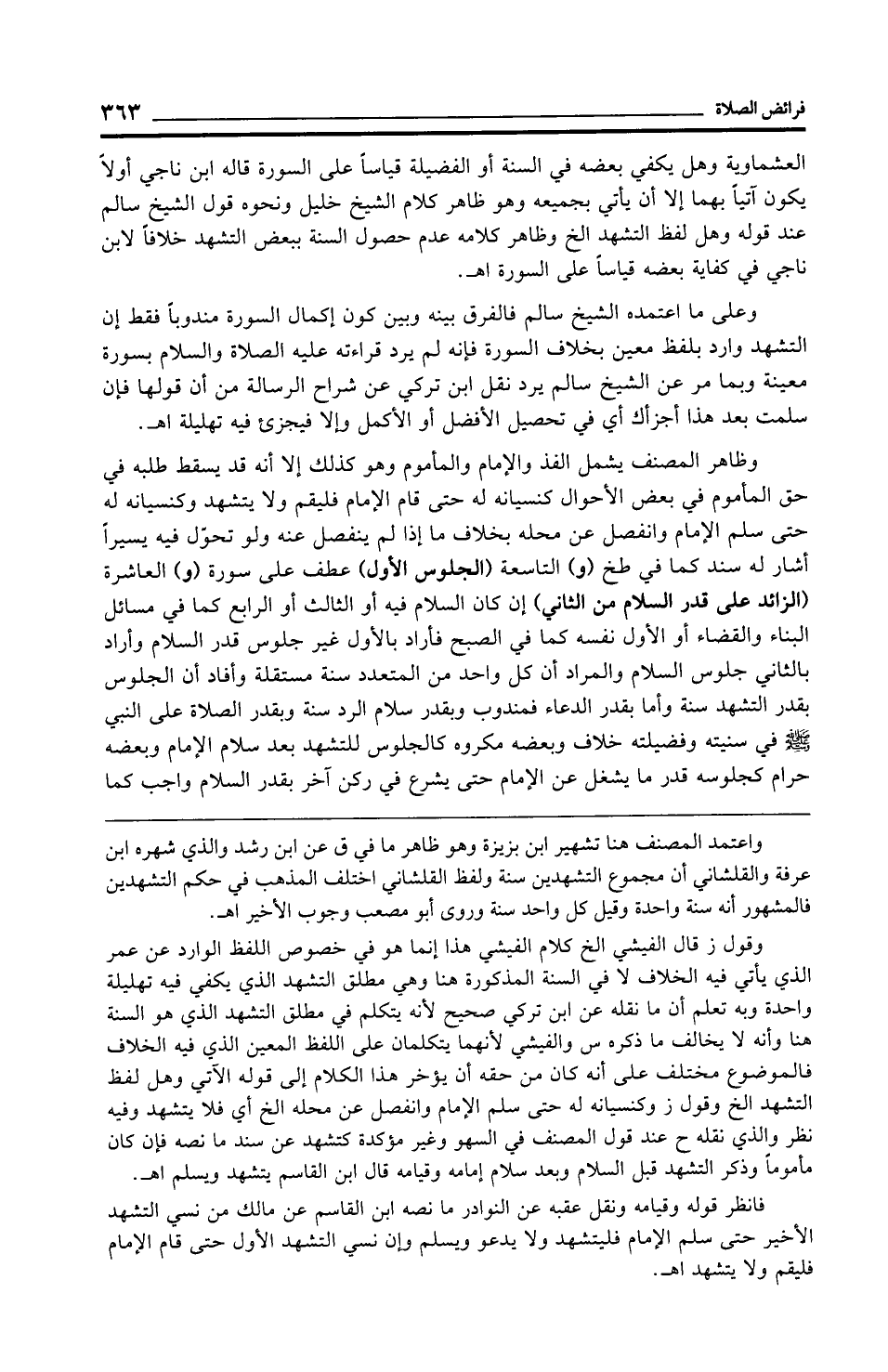 وعلى ما اعتمده الشيخ سالم فالفرق بينه وبين كون إكمال السورة مندوبًا فقط إن التشهد وارد بلفظ معين بخلاف السورة فإنه لم يرد قراءته عليه الصلاة والسلام بسورة معينة وبما مر عن الشيخ سالم يرد نقل ابن تركي عن شراح الرسالة من أن قولها فإن سلمت بعد هذا أجزأك أي في تحصيل الأفضل أو الأكمل وإلا فيجزئ فيه تهليلة اهـ.
