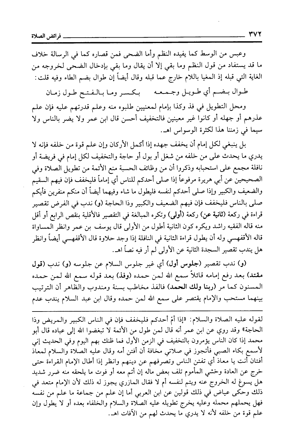 ومحل التطويل في فذ وكذا بإمام لمعنيين طلبوه منه وعلم قدرتهم عليه فإن علم عذرهم أو جهله أو كانوا غير معينين فالتخفيف أحسن قال ابن عمر ولا يضر بالناس ولا سيما في زمننا هذا لكثرة الوسواس اهـ.