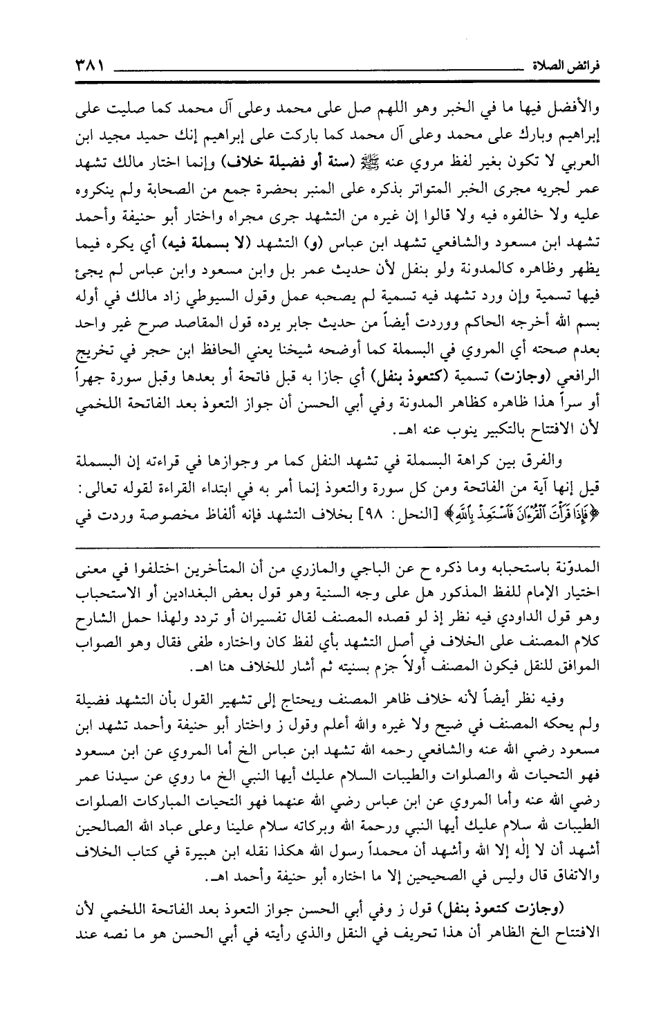 والفرق بين كراهة البسملة في تشهد النفل كما مر وجوازها في قراءته إن البسملة قيل إنها آية من الفاتحة ومن كل سورة والتعوذ إنما أمر به في ابتداء القراءة لقوله تعالى: {فَإِذَا قَرَأْتَ الْقُرْآنَ فَاسْتَعِذْ بِاللَّهِ} [النحل: 98] بخلاف التشهد فإنه ألفاظ مخصوصة وردت في