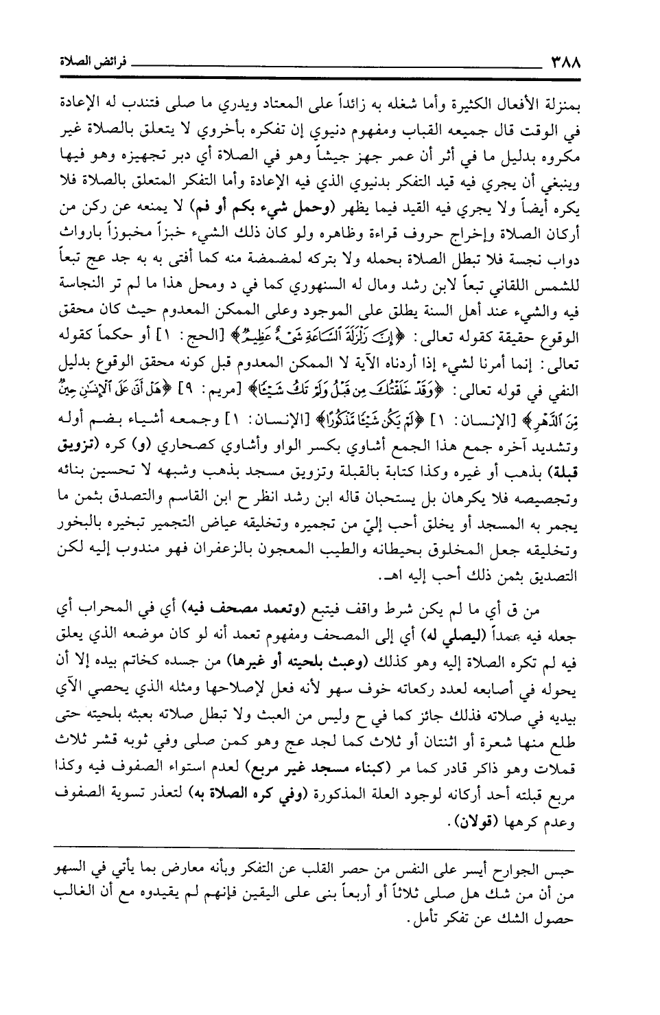 بمنزلة الأفعال الكثيرة وأما شغله به زائدًا على المعتاد ويدري ما صلى فتندب له الإعادة في الوقت قال جميعه القباب ومفهوم دنيوي إن تفكره بأخروي لا يتعلق بالصلاة غير مكروه بدليل ما في أثر أن عمر جهز جيشًا وهو في الصلاة أي دبر تجهيزه وهو فيها وينبغي أن يجري فيه قيد التفكر بدنيوي الذي فيه الإعادة وأما التفكر المتعلق بالصلاة فلا يكره أيضًا ولا يجري فيه القيد فيما يظهر (وحمل شيء بكم أو فم) لا يمنعه عن ركن من أركان الصلاة وإخراج حروف قراءة وظاهره ولو كان ذلك الشيء خبزًا مخبوزًا بأرواث دواب نجسة فلا تبطل الصلاة بحمله ولا بتركه لمضمضة منه كما أفتى به به جد عج تبعًا للشمس اللقاني تبعًا لابن رشد ومال له السنهوري كما في د ومحل هذا ما لم تر النجاسة فيه والشيء عند أهل السنة يطلق على الموجود وعلى الممكن المعدوم حيث كان محقق الوقوع حقيقة كقوله تعالى: {إِنَّ زَلْزَلَةَ السَّاعَةِ شَيْءٌ عَظِيمٌ} [الحج: 1] أو حكمًا كقوله تعالى: إنما أمرنا لشيء إذا أردناه الآية لا الممكن المعدوم قبل كونه محقق الوقوع بدليل النفي في قوله تعالى: {وَقَدْ خَلَقْتُكَ مِنْ قَبْلُ وَلَمْ تَكُ شَيْئًا} [مريم: 9 {هَلْ أَتَى عَلَى الْإِنْسَانِ حِينٌ مِنَ الدَّهْرِ} [الإنسان: 1] {لَمْ يَكُنْ شَيْئًا مَذْكُورًا} [الإنسان:1] وجمعه أشياء بضم أوله وتشديد آخره جمع هذا الجمع أشاوي بكسر الواو وأشاوي كصحاري (و) كره (تزويق قبلة) بذهب أو غيره وكذا كتابة بالقبلة وتزويق مسجد بذهب وشبهه لا تحسين بنائه وتجصيصه فلا يكرهان بل يستحبان قاله ابن رشد انظر ح ابن القاسم والتصدق بثمن ما يجمر به المسجد أو يخلق أحب إليّ من تجميره وتخليقه عياض التجمير تبخيره بالبخور وتخليقه جعل المخلوق بحيطانه والطيب المعجون بالزعفران فهو مندوب إليه لكن التصديق بثمن ذلك أحب إليه اهـ.