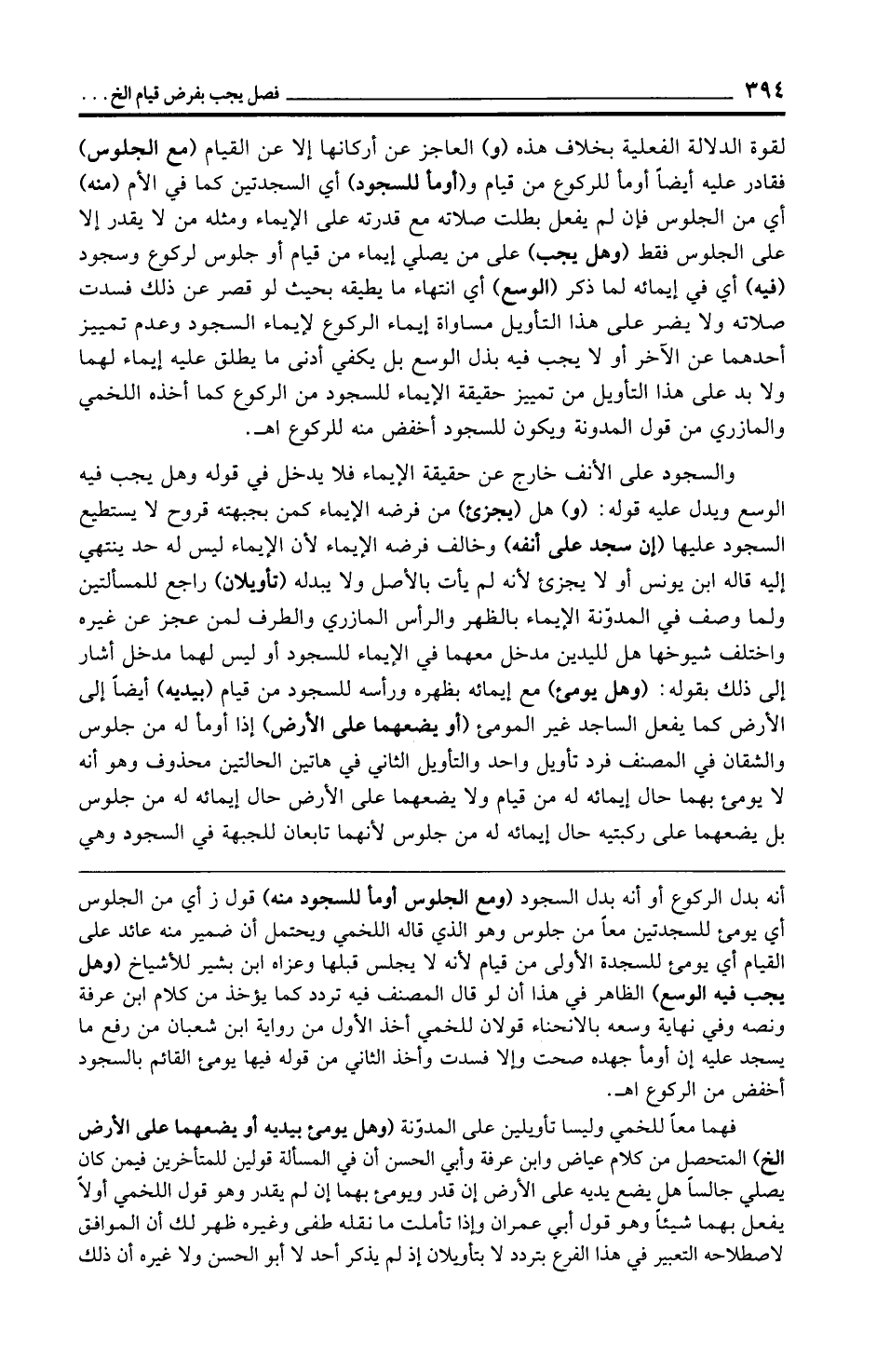 فهما معًا للخمي وليسا تأويلين على المدوّنة (وهل يؤمن بيديه أو يضعهما على الأرض الخ) المتحصل من كلام عياض وابن عرفة وأبي الحسن أن في المسألة قولين للمتأخرين فيمن كان يصلي جالسًا هل يضع يديه على الأرض إن قدر ويومئ بهما إن لم يقدر وهو قول اللخمي أولًا يفعل بهما شيئًا وهو قول أبي عمران وإذا تأملت ما نقله طفى وغيره ظهر لك أن الموافق لاصطلاحه التعبير في هذا الفرع بتردد لا بتأويلان إذ لم يذكر أحد لا أبو الحسن ولا غيره أن ذلك