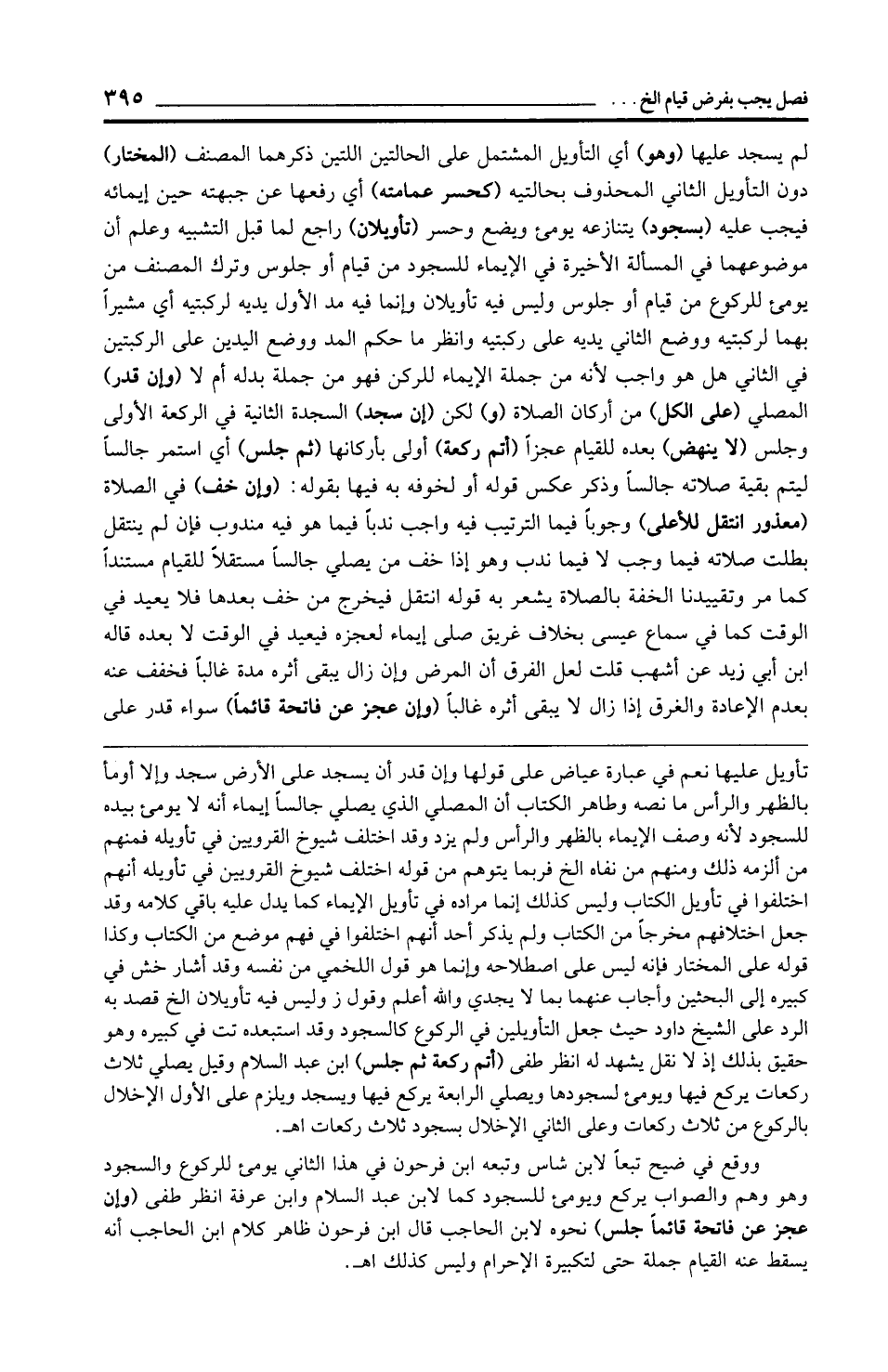 لم يسجد عليها (وهو) أي التأويل المشتمل على الحالتين اللتين ذكرهما المصنف (المختار) دون التأويل الثاني المحذوف بحالتيه (كحسر عمامته) أي رفعها عن جبهته حين إيمائه فيجب عليه (بسجود) يتنازعه يومئ ويضع وحسر (تأويلان) راجع لما قبل التشبيه وعلم أن موضوعهما في المسألة الأخيرة في الإيماء للسجود من قيام أو جلوس وترك المصنف من يومئ للركوع من قيام أو جلوس وليس فيه تأويلان وإنما فيه مد الأول يديه لركبتيه أي مشيرًا بهما لركبتيه ووضع الثاني يديه على ركبتيه وانظر ما حكم المد ووضع اليدين على الركبتين في الثاني هل هو واجب لأنه من جملة الإيماء للركن فهو من جملة بدله أم لا (وإن قدر) المصلي (على الكل) من أركان الصلاة (و) لكن (إن سجد) السجدة الثانية في الركعة الأولى وجلس (لا ينهض) بعده للقيام عجزًا (أتم ركعة) أولى بأركانها (ثم جلس) أي استمر جالسًا ليتم بقية صلاته جالسًا وذكر عكس قوله أو لخوفه به فيها بقوله: (وإن خف) في الصلاة (معذور انتقل للأعلى) وجوبًا فيما الترتيب فيه واجب ندبًا فيما هو فيه مندوب فإن لم ينتقل بطلت صلاته فيما وجب لا فيما ندب وهو إذا خف من يصلي جالسًا مستقلًا للقيام مستندًا كما مر وتقييدنا الخفة بالصلاة يشعر به قوله انتقل فيخرج من خف بعدها فلا يعيد في الوقت كما في سماع عيسى بخلاف غريق صلى إيماء لعجزه فيعيد في الوقت لا بعده قاله ابن أبي زيد عن أشهب قلت لعل الفرق أن المرض وإن زال يبقى أثره مدة غالبًا فخفف عنه بعدم الإعادة والغرق إذا زال لا يبقى أثره غالبًا (وإن عجز عن فاتحة قائمًا) سواء قدر على