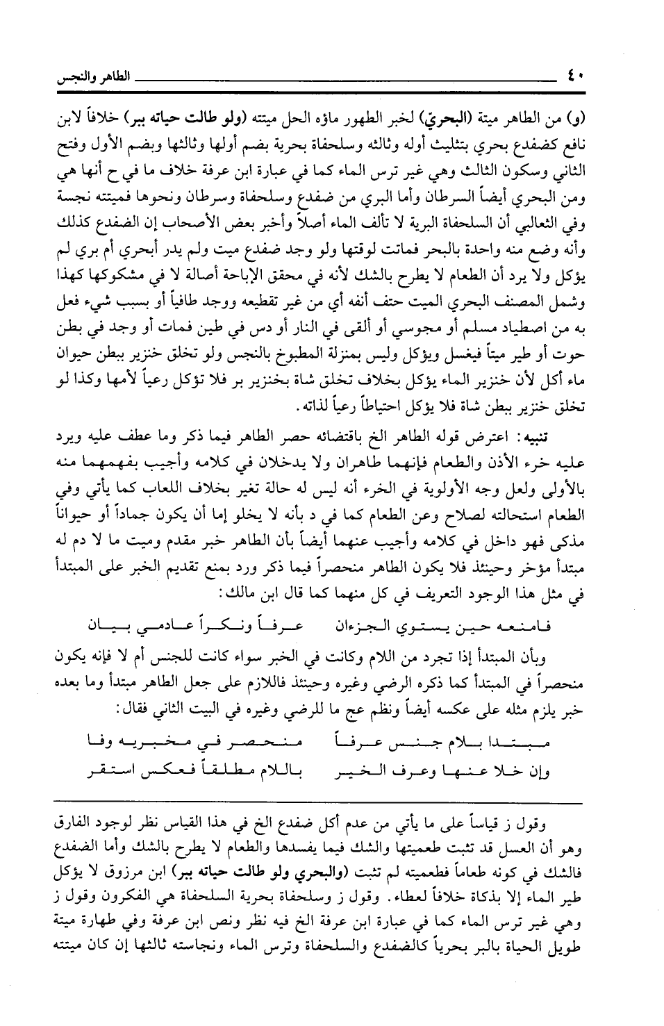 وقول ز قياسًا على ما يأتي من عدم أكل ضفدع الخ في هذا القياس نظر لوجود الفارق وهو أن العسل قد تثبت طعميتها والشك فيما يفسدها والطعام لا يطرح بالشك وأما الضفدع فالشك في كونه طعامًا فطعميته لم تثبت (والبحري ولو طالت حياته ببر) ابن مرزوق لا يؤكل طير الماء إلا بذكاة خلافًا لعطاء. وقول ز وسلحفاة بحرية السلحفاة هي الفكرون وقول ز وهي غير ترس الماء كما في عبارة ابن عرفة الخ فيه نظر ونص ابن عرفة وفي طهارة ميتة طويل الحياة بالبر بحريًّا كالضفدع والسلحفاة وترس الماء ونجاسته ثالثها إن كان ميتته