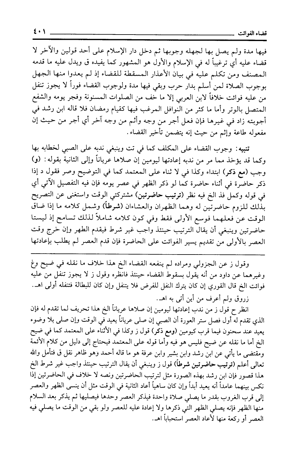 انظر ح قول ز من ندب إعادتها ليومين إن صلاها عريانًا الخ هذا تحريف لما تقدم له فإن الذي تقدم له أول فصل ستر العورة أن الصبي إن صلى عريانًا يعيد في الوقت وإن صلى بلا وضوء يعيد عند سحنون فيما قرب كيومين (ومع ذكر) قول ز وكذا في الأثناء على المعتمد كما في ضيح الخ أما ما نقله عن ضيح فليس هو فيه وأما قوله على المعتمد فيحتاج إلى دليل من كلام الأئمة ومقتضى ما يأتي عن ابن رشد وابن بشير وابن عرفة هو ما قاله أحمد وهو ظاهر نقل ق فتأمل والله تعالى أعلم (ترتيب حاضرتين شرطًا) قول ز وينبغي أن يقال الترتيب حينئذ واجب غير شرط الخ هذا قصور فإن ابن رشد بهذه الصورة مثل لترتيب الحاضرتين ونصه لا خلاف في الحاضرتين إذا نكس بينهما عامدًا أنه يعيد أبدًا وإن كان ساهيًا أعاد الثانية في الوقت مثل أن ينسى الظهر والعصر إلى قرب الغروب بقدر ما يصلي صلاة واحدة فيذكر العصر وحدها فيصليها ثم يذكر بعد السلام منها الظهر فإنه يصلي الظهر التي ذكرها ولا إعادة عليه للعصر ولو بقي من الوقت ما يصلي فيه العصر أو ركعة منها لأعاد العصر استحبابًا اهـ.