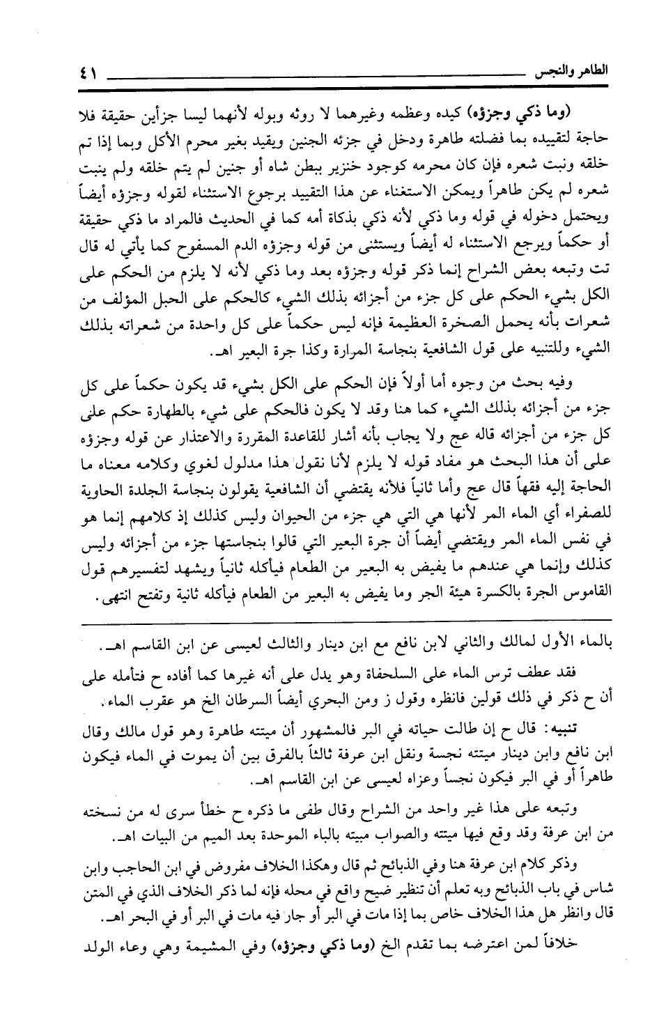 (وما ذكي وجزؤه) كيده وعظمه وغيرهما لا روثه وبوله لأنهما ليسا جزأين حقيقة فلا حاجة لتقييده بما فضلته طاهرة ودخل في جزئه الجنين ويقيد بغير محرم الأكل وبما إذا تم خلقه ونبت شعره فإن كان محرمه كوجود خنزير ببطن شاه أو جنين لم يتم خلقه ولم ينبت شعره لم يكن طاهرًا ويمكن الاستغناء عن هذا التقييد برجوع الاستثناء لقوله وجزؤه أيضًا ويحتمل دخوله في قوله وما ذكي لأنه ذكي بذكاة أمه كما في الحديث فالمراد ما ذكي حقيقة أو حكمًا ويرجع الاستثناء له أيضًا ويستثنى من قوله وجزؤه الدم المسفوح كما يأتي له قال تت وتبعه بعض الشراح إنما ذكر قوله وجزؤه بعد وما ذكي لأنه لا يلزم من الحكم على الكل بشيء الحكم على كل جزء من أجزائه بذلك الشيء كالحكم على الحبل المؤلف من شعرات بأنه يحمل الصخرة العظيمة فإنه ليس حكمًا على كل واحدة من شعراته بذلك الشيء وللتنبيه على قول الشافعية بنجاسة المرارة وكذا جرة البعير اهـ.