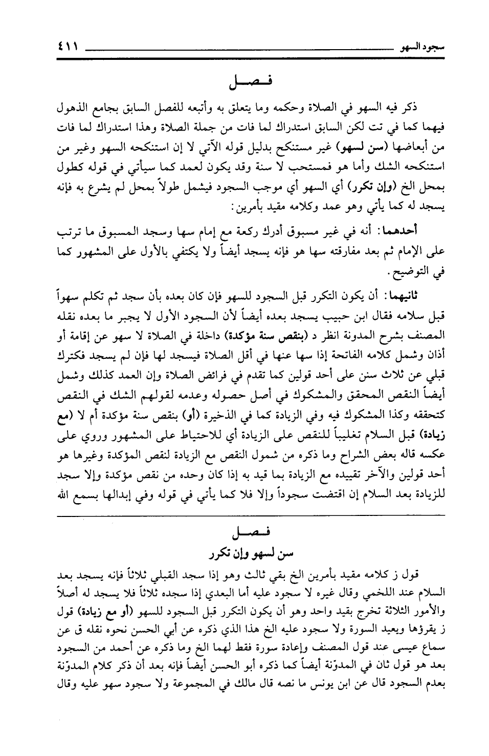 ثانيهما: أن يكون التكرر قبل السجود للسهو فإن كان بعده بأن سجد ثم تكلم سهوًا قبل سلامه فقال ابن حبيب يسجد بعده أيضًا لأن السجود الأول لا يجبر ما بعده نقله المصنف بشرح المدونة انظر د (بنقص سنة مؤكدة) داخلة في الصلاة لا سهو عن إقامة أو أذان وشمل كلامه الفاتحة إذا سها عنها في أقل الصلاة فيسجد لها فإن لم يسجد فكترك قبلي عن ثلاث سنن على أحد قولين كما تقدم في فرائض الصلاة وإن العمد كذلك وشمل أيضًا النقص المحقق والمشكوك في أصل حصوله وعدمه لقولهم الشك في النقص كتحققه وكذا المشكوك فيه وفي الزيادة كما في الذخيرة (أو) بنقص سنة مؤكدة أم لا (مع زيادة) قبل السلام تغليبًا للنقص على الزيادة أي للاحتياط على المشهور وروي على عكسه قاله بعض الشراح وما ذكره من شمول النقص مع الزيادة لنقص المؤكدة وغيرها هو أحد قولين والآخر تقييده مع الزيادة بما قيد به إذا كان وحده من نقص مؤكدة وإلا سجد للزيادة بعد السلام إن اقتضت سجودًا وإلا فلا كما يأتي في قوله وفي إبدالها بسمع الله