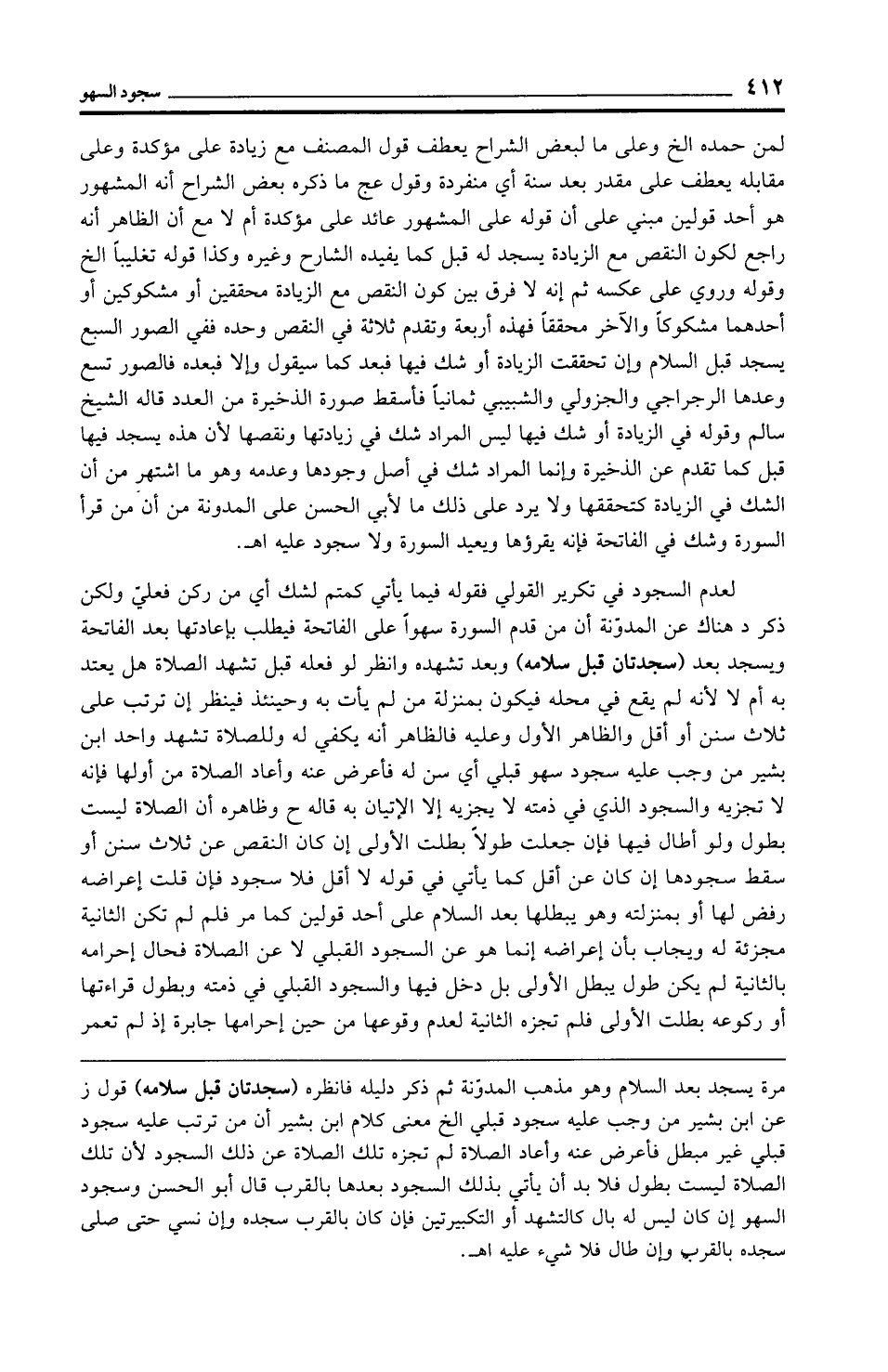 مرة يسجد بعد السلام وهو مذهب المدوّنة ثم ذكر دليله فانظره (سجدتان قبل سلامه) قول ز عن ابن بشير من وجب عليه سجود قبلي الخ معنى كلام ابن بشير أن من ترتب عليه سجود قبلي غير مبطل فأعرض عنه وأعاد الصلاة لم تجزه تلك الصلاة عن ذلك السجود لأن تلك الصلاة ليست بطول فلا بد أن يأتي بذلك السجود بعدها بالقرب قال أبو الحسن وسجود السهو إن كان ليس له بال كالتشهد أو التكبيرتين فإن كان بالقرب سجده وإن نسي حتى صلى سجده بالقرب وإن طال فلا شيء عليه اهـ.