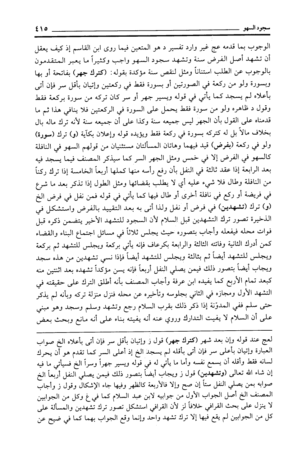 لعج عند قوله وإن بعد شهر (كترك جهر) قول ز وإتيان بأقل سر فإن أتى بأعلاه الخ صواب العبارة وإتيان بأعلى سر فإن أتى بأقله لم يسجد الخ إذ أعلى السر كما تقدم هو أن يحرك لسانه فقط وأقله أن يسمع نفسه وأما ما يأتي له في قوله ويسير جهرًا وسرًّا الخ فسيأتي ما فيه إن شاء الله تعالى (وتشهدين) قول ز ويجاب أيضًا بتصور ذلك فيمن يصلي النفل أربعًا الخ صوابه بمن يصلي النفل ستًّا إن صح وإلا فالأربعة كالظهر وفيها جاء الإشكال وقول ز وأجاب المصنف الخ أصل الجواب الأول من جوابيه لابن عبد السلام كما في غ وكل من الجوابين لا ينزل على بحث القرافي خلافًا لز لأن القرافي استشكل تصور ترك تشهدين والمسألة على كل من الجوابين لم يقع فيها إلا ترك تشهد واحد وإنما وقع الجواب بهما كما في ضيح عن