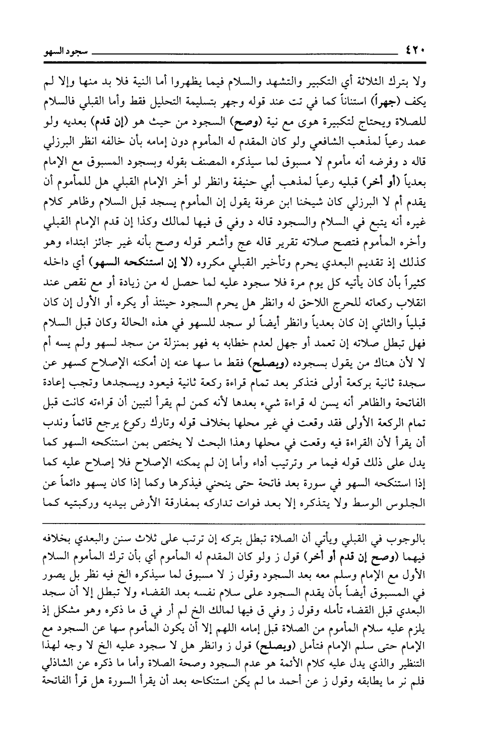 بالوجوب في القبلي ويأتي أن الصلاة تبطل بتركه إن ترتب على ثلاث سنن والبعدي بخلافه فيهما (وصح إن قدم أو أخر) قول ز ولو كان المقدم له المأموم أي بأن ترك المأموم السلام الأول مع الإمام وسلم معه بعد السجود وقول ز لا مسبوق لما سيذكره الخ فيه نظر بل يصور في المسبوق أيضًا بأن يقدم السجود على سلام نفسه بعد القضاء ولا تبطل إلا أن سجد البعدي قبل القضاء تأمله وقول ز وفي ق فيها لمالك الخ لم أر في ق ما ذكره وهو مشكل إذ يلزم عليه سلام المأموم من الصلاة قبل إمامه اللهم إلا أن يكون المأموم سها عن السجود مع الإمام حتى سلم الإمام فتأمل (ويصلح) قول ز وانظر هل لا سجود عليه الخ لا وجه لهذا التنظير والذي يدل عليه كلام الأئمة هو عدم السجود وصحة الصلاة وأما ما ذكره عن الشاذلي فلم نر ما يطابقه وقول ز عن أحمد ما لم يكن استنكاحه بعد أن يقرأ السورة هل قرأ الفاتحة