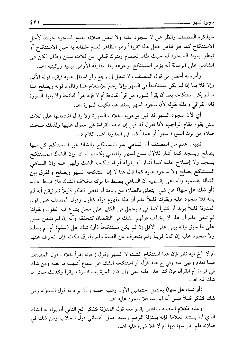 تنبيه: علم من المصنف أن الساهي غير المستنكح والشاك غير المستنكح كل منها يصلح ويسجد كما أشار للأوّل بسن لسهو وللثاني بكمتم لشك وإن الشاك المستنكح يسجد ولا إصلاح عليه كما أشار له بقوله أو استنكحه الشك ولهى عنه وإن الساهي المستنكح يصلح ولا سجود عليه كما قال هنا لا إن استنكحه السهو ويصلح والفرق بين الشاك بقسميه والساهي بقسميه أن الساهي يضبط ما تركه بخلاف الشاك فلا ضبط عنده (أو شك هل سها) عن شيء يتعلق بالصلاة من زيادة أو نقص فتفكر قليلًا ثم تيقن أنه لم يسه فلا سجود عليه وبقولنا قليلًا علم أن هذا مفهوم قوله كطول وقول المصنف على قول المدونة قليلًا يريد أو كثيرًا كما في د يحمل في الكثير على محل يشرع فيه الطول وبقولنا ثم تيقن علم أن هذا لا يخالف قولهم الشك في النقصان كتحققه وأنه إن لم يتيقن عمل على ما سبق وأنه يبني على الأقل إن لم يكن مستنكحًا (أو) شك هل (سلم) أم لم يسلم ولا سجود عليه إن كان قريبًا ولم ينحرف عن القبلة ولم يفارق مكانه فإن انحرف عنها