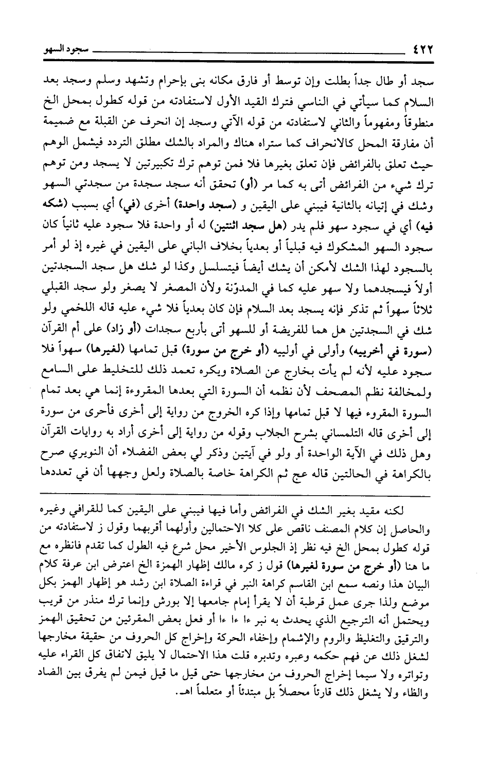 لكنه مقيد بغير الشك في الفرائض وأما فيها فيبني على اليقين كما للقرافي وغيره والحاصل إن كلام المصنف ناقص على كلا الاحتمالين وأولهما أقربهما وقول ز لاستفادته من قوله كطول بمحل الخ فيه نظر إذ الجلوس الأخير محل شرع فيه الطول كما تقدم فانظره مع ما هنا (أو خرج من سورة لغيرها) قول ز كره مالك إظهار الهمزة الخ اعترض ابن عرفة كلام البيان هذا ونصه سمع ابن القاسم كراهة المنبر في قراءة الصلاة ابن رشد هو إظهار الهمز بكل موضع ولذا جرى عمل قرطبة أن لا يقرأ إمام جامعها إلا بورش وإنما ترك منذر من قريب ويحتمل أنه الترجيح الذي يحدث به نبر ءا ءا ءا أو فعل بعض المقرئين من تحقيق الهمز والترقيق والتغليظ والروم والإشمام وإخفاء الحركة وإخراج كل الحروف من حقيقة مخارجها لشغل ذلك عن فهم حكمه وعبره وتدبره قلت هذا الاحتمال لا يليق لاتفاق كل القراء عليه وتواتره ولا سيما إخراج الحروف من مخارجها حتى قيل ما قيل فيمن لم يفرق بين الضاد والظاء ولا يشغل ذلك قارئًا محصلًا بل مبتدئًا أو متعلمًا اهـ.