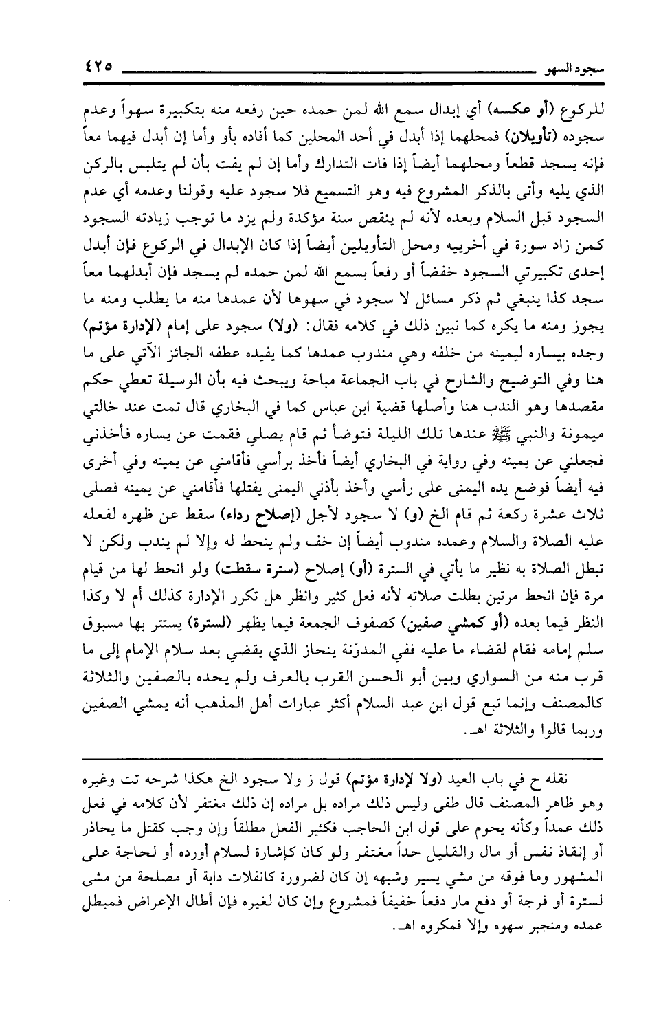 نقله ح في باب العيد (ولا لإدارة مؤتم) قول ز ولا سجود الخ هكذا شرحه تت وغيره وهو ظاهر المصنف قال طفى وليس ذلك مراده بل مراده إن ذلك مغتفر لأن كلامه في فعل ذلك عمدًا وكأنه يحوم على قول ابن الحاجب فكثير الفعل مطلقًا وإن وجب كقتل ما يحاذر أو إنقاذ نفس أو مال والقليل حدًّا مغتفر ولو كان كإشارة لسلام أورده أو لحاجة على المشهور وما فوقه من مشي يسير وشبهه إن كان لضرورة كانفلات دابة أو مصلحة من مشى لسترة أو فرجة أو دفع مار دفعًا خفيفًا فمشروع وإن كان لغيره فإن أطال الإعراض فمبطل عمده ومنجبر سهوه وإلا فمكروه اهـ.