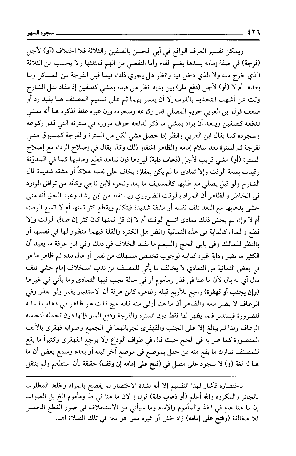 ويمكن تفسير العرف الواقع في أبي الحسن بالصفين والثلاثة فلا اختلاف (أو) لأجل (فرجة) في صفة إمامه يسدها بضم الفاء وأما التفصي من الهم فمثلثها ولا يحسب من الثلاثة الذي خرج منه ولا الذي دخل فيه وانظر هل يجري ذلك فيما قبل الفرجة من المسائل وما بعدها أم لا (أو) لأجل (دفع مار) بين يديه انظر من قيده بمشي كصفين إذ مفاد نقل الشارح وتت عن أشهب التحديد بالقرب إلا أن يفسر بهما ثم على تسليم المصنف هنا يفيد رد أو ضعف قول ابن العربي حريم المصلي قدر ركوعه وسجوده وإن غيره غلط لذكره هنا أنه يمشي لدفعه كصفين ويبعد أن يراد بمشي ما ذكر لدفعه خوف مروره في سترته التي قدر ركوعه وسجوده كما يقال ابن العربي وانظر إذا حصل مشي لكل من السترة والفرجة كمسبوق مشي لفرجة ثم لسترة بعد سلام إمامه والظاهر اغتفار ذلك وكذا يقال في إصلاح الرداء مع إصلاح السترة (أو) مشي قريب لأجل (ذهاب دابة) ليردها فإن تباعد قطع وطلبها كما في المدوّنة وقيدت بسعة الوقت وإلا تمادى ما لم يكن بمفازة يخاف على نفسه هلاكًا أو مشقة شديدة قال الشارح ولو قيل يصلي مع طلبها كالمسايف ما بعد ونحوه لابن ناجي وكأنه من توافق الوارد في الخاطر والظاهر أن المراد بالوقت الضروري ويستفاد من ابن رشد وعبد الحق أنه متى خشي بذهابها مع البعد تلف نفسه أو مشقة شديدة فيتكلم ويقطع كثر ثمنها أم لا اتسع الوقت أم لا وإن لم يخش ذلك تمادى اتسع الوقت أم لا إن قل ثمنها كان كثر إن ضاق الوقت وإلا قطع والمال كالدابة في هذه الثمانية وانظر هل الكثرة والقلة فيهما منظور لها في نفسها أو بالنظر للمالك وفي بابي الحج والتيمم ما يفيد الخلاف في ذلك وفي ابن عرفة ما يفيد أن الكثير ما يضر ودابة غيره كدابته لوجوب تخليص مستهلك من نفس أو مال بيده ثم ظاهر ما مر في بعض الثمانية من التمادي لا يخالف ما يأتي للمصنف من ندب استخلاف إمام خشي تلف مال أي له بال لأن ما هنا في فذر ومأموم أو في حالة يجب فيها التمادي وما يأتي في غيرها (وإن بجنب أو قهقرة) راجع للأربع قبله وظاهره كابن عرفة أن الاستدبار يضر ولو لعذر وفي الرعاف لا يضر معه والظاهر أن ما هنا أولى منه قاله عج قلت هو ظاهر في ذهاب الدابة للضرورة فيستدبر فيما يظهر لها فقط دون السترة والفرجة ودفع المار فإنها دون تحمله لنجاسة الرعاف ولذا لم يبالغ إلا على الجنب والقهقرى لجريانهما في الجميع وصوابه قهقرى بالألف المقصورة كما عبر به في الحج حيث قال في طواف الوداع ولا يرجع القهقرى وكثيرًا ما يقع للمصنف تدارك ما يقع منه من خلل بموضع في موضع آخر قبله أو بعده وسمع بعض أن ما هنا له لغة (و) لا سجود على مصل في (فتح على إمامه إن وقف) حقيقة بأن استطعم ولم ينتقل