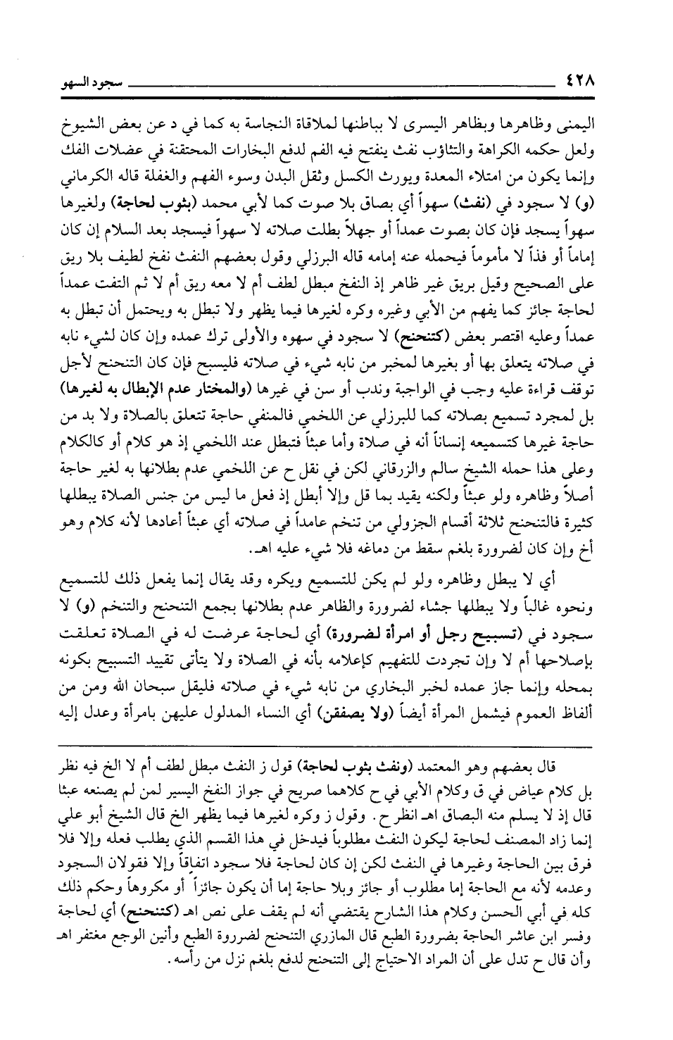 اليمنى وظاهرها وبظاهر اليسرى لا بباطنها لملاقاة النجاسة به كما في د عن بعض الشيوخ ولعل حكمه الكراهة والتثاؤب نفث ينفتح فيه الفم لدفع البخارات المحتقنة في عضلات الفك وإنما يكون من امتلاء المعدة ويورث الكسل وثقل البدن وسوء الفهم والغفلة قاله الكرماني (و) لا سجود في (نفث) سهوًا أي بصاق بلا صوت كما لأبي محمد (بثوب لحاجة) ولغيرها سهوًا يسجد فإن كان بصوت عمدًا أو جهلًا بطلت صلاته لا سهوًا فيسجد بعد السلام إن كان إمامًا أو فذًّا لا مأمومًا فيحمله عنه إمامه قاله البرزلي وقول بعضهم النفث نفخ لطيف بلا ريق على الصحيح وقيل بريق غير ظاهر إذ النفخ مبطل لطف أم لا معه ريق أم لا ثم التفت عمدًا لحاجة جائز كما يفهم من الأبي وغيره وكره لغيرها فيما يظهر ولا تبطل به ويحتمل أن تبطل به عمدًا وعليه اقتصر بعض (كتنحنح) لا سجود في سهوه والأولى ترك عمده وإن كان لشيء نابه في صلاته يتعلق بها أو بغيرها لمخبر من نابه شيء في صلاته فليسبح فإن كان التنحنح لأجل توقف قراءة عليه وجب في الواجبة وندب أو سن في غيرها (والمختار عدم الإبطال به لغيرها) بل لمجرد تسميع بصلاته كما للبرزلي عن اللخمي فالمنفي حاجة تتعلق بالصلاة ولا بد من حاجة غيرها كتسميعه إنسانًا أنه في صلاة وأما عبثًا فتبطل عند اللخمي إذ هو كلام أو كالكلام وعلى هذا حمله الشيخ سالم والزرقاني لكن في نقل ح عن اللخمي عدم بطلانها به لغير حاجة أصلًا وظاهره ولو عبثًا ولكنه يقيد بما قل وإلا أبطل إذ فعل ما ليس من جنس الصلاة يبطلها كثيرة فالتنحنح ثلاثة أقسام الجزولي من تنخم عامدًا في صلاته أي عبثًا أعادها لأنه كلام وهو أخ وإن كان لضرورة بلغم سقط من دماغه فلا شيء عليه اهـ.