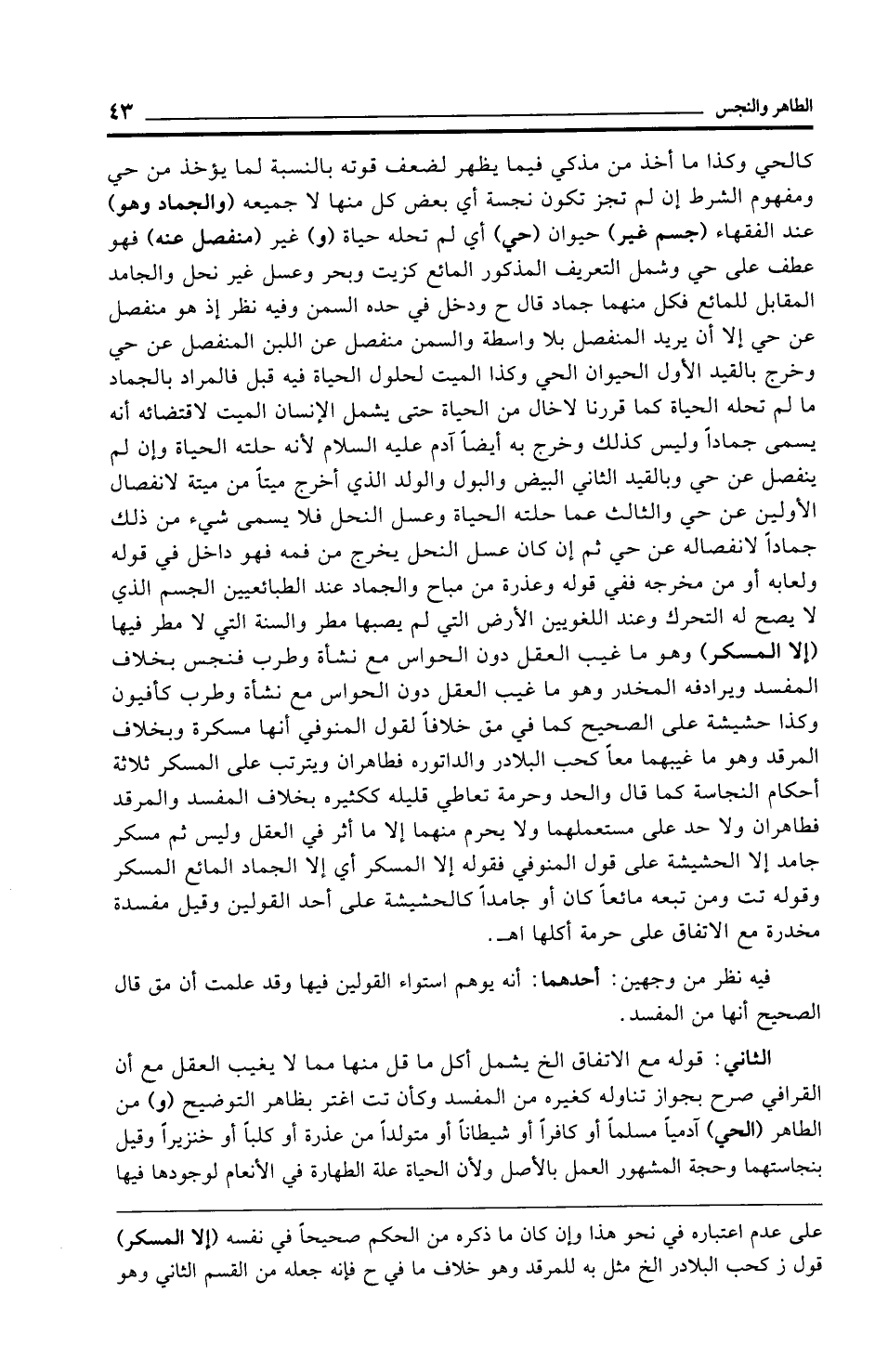 كالحي وكذا ما أخذ من مذكي فيما يظهر لضعف قوته بالنسبة لما يؤخذ من حي ومفهوم الشرط إن لم تجز تكون نجسة أي بعض كل منها لا جميعه (والجماد وهو) عند الفقهاء (جسم غير) حيوان (حي) أي لم تحله حياة (و) غير (منفصل عنه) فهو عطف على حي وشمل التعريف المذكور المائع كزيت وبحر وعسل غير نحل والجامد المقابل للمائع فكل منهما جماد قال ح ودخل في حده السمن وفيه نظر إذ هو منفصل عن حي إلا أن يريد المنفصل بلا واسطة والسمن منفصل عن اللبن المنفصل عن حي وخرج بالقيد الأول الحيوان الحي وكذا الميت لحلول الحياة فيه قبل فالمراد بالجماد ما لم تحله الحياة كما قررنا لا خال من الحياة حتى يشمل الإنسان الميت لاقتضائه أنه يسمى جمادًا وليس كذلك وخرج به أيضًا آدم عليه السلام لأنه حلته الحياة وإن لم ينفصل عن حي وبالقيد الثاني البيض والبول والولد الذي أخرج ميتًا من ميتة لانفصال الأولين عن حي والثالث عما حلته الحياة وعسل النحل فلا يسمى شيء من ذلك جمادًا لانفصاله عن حي ثم إن كان عسل النحل يخرج من فمه فهو داخل في قوله ولعابه أو من مخرجه ففي قوله وعذرة من مباح والجماد عند الطبائعيين الجسم الذي لا يصح له التحرك وعند اللغويين الأرض التي لم يصبها مطر والسنة التي لا مطر فيها (إلا المسكر) وهو ما غيب العقل دون الحواس مع نشأة وطرب فنجس بخلاف المفسد ويرادفه المخدر وهو ما غيب العقل دون الحواس مع نشأة وطرب كأفيون وكذا حشيشة على الصحيح كما في مق خلافًا لقول المنوفي أنها مسكرة وبخلاف المرتد وهو ما غيبهما معًا كحب البلادر والداتوره فطاهران ويترتب على المسكر ثلاثة أحكام النجاسة كما قال والحد وحرمة تعاطي قليله ككثيره بخلاف المفسد والمرقد فطاهران ولا حد على مستعملهما ولا يحرم منهما إلا ما أثر في العقل وليس ثم مسكر جامد إلا الحشيشة على قول المنوفي فقوله إلا المسكر أي إلا الجماد المائع المسكر وقوله تت ومن تبعه مائعًا كان أو جامدًا كالحشيشة على أحد القولين وقيل مفسدة مخدرة مع الاتفاق على حرمة أكلها اهـ.