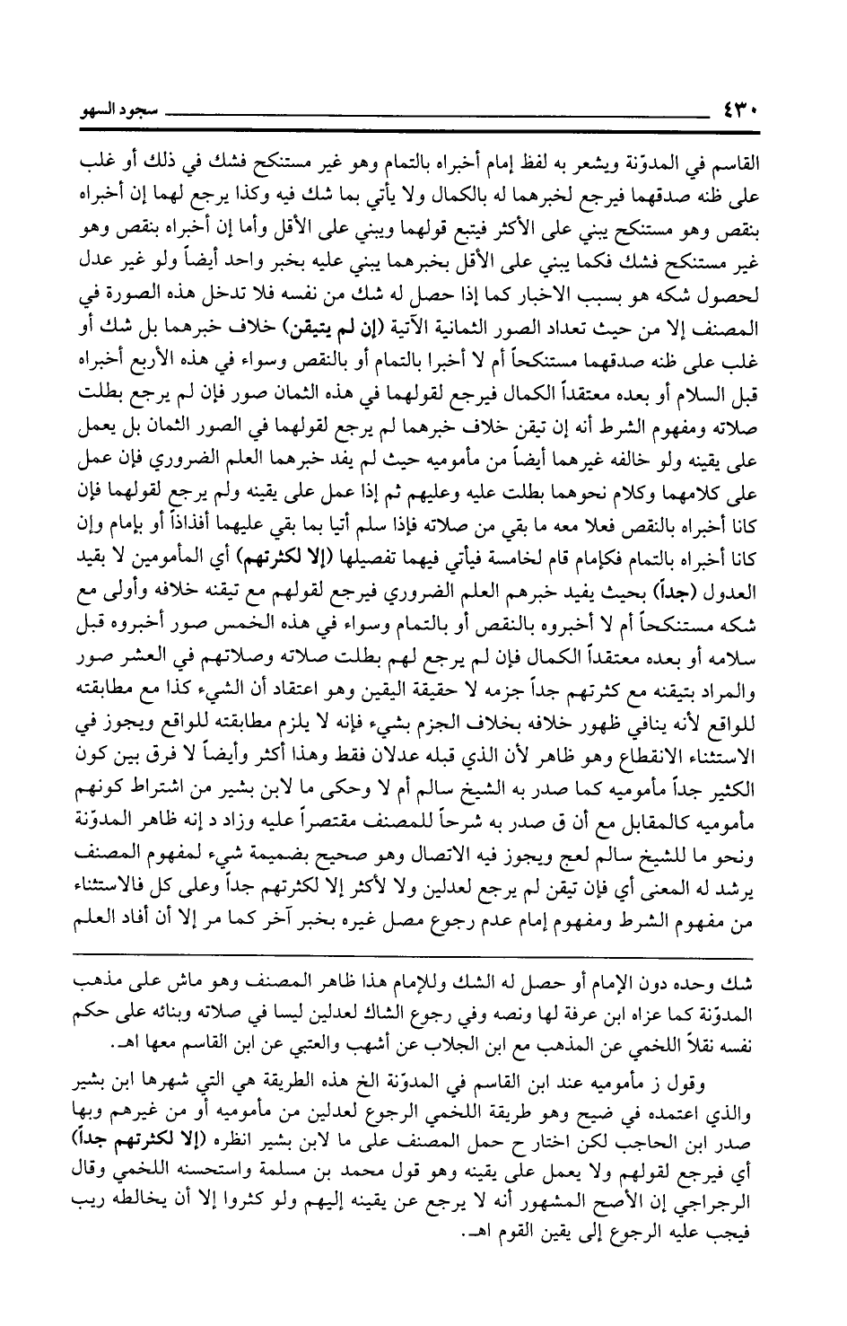 القاسم في المدوّنة ويشعر به لفظ إمام أخبراه بالتمام وهو غير مستنكح فشك في ذلك أو غلب على ظنه صدقهما فيرجع لخبرهما له بالكمال ولا يأتي بما شك فيه وكذا يرجع لهما إن أخبراه بنقص وهو مستنكح يبني على الأكثر فيتبع قولهما ويبني على الأقل وأما إن أخبراه بنقص وهو غير مستنكح فشك فكما يبني على الأقل بخبرهما يبني عليه بخبر واحد أيضًا ولو غير عدل لحصول شكه هو بسبب الأخبار كما إذا حصل له شك من نفسه فلا تدخل هذه الصورة في المصنف إلا من حيث تعداد الصور الثمانية الآتية (إن لم يتيقن) خلاف خبرهما بل شك أو غلب على ظنه صدقهما مستنكحًا أم لا أخبرا بالتمام أو بالنقص وسواء في هذه الأربع أخبراه قبل السلام أو بعده معتقدًا الكمال فيرجع لقولهما في هذه الثمان صور فإن لم يرجع بطلت صلاته ومفهوم الشرط أنه إن تيقن خلاف خبرهما لم يرجع لقولهما في الصور الثمان بل يعمل على يقينه ولو خالفه غيرهما أيضًا من مأموميه حيث لم يفد خبرهما العلم الضروري فإن عمل على كلامهما وكلام نحوهما بطلت عليه وعليهم ثم إذا عمل على يقينه ولم يرجع لقولهما فإن كانا أخبراه بالنقص فعلا معه ما بقي من صلاته فإذا سلم أتيا بما بقي عليهما أفذاذًا أو بإمام وإن كانا أخبراه بالتمام فكإمام قام لخامسة فيأتي فيهما تفصيلها (إلا لكثرتهم) أي المأمومين لا بقيد العدول (جدًّا) بحيث يفيد خبرهم العلم الضروري فيرجع لقولهم مع تيقنه خلافه وأولى مع شكه مستنكحًا أم لا أخبروه بالنقص أو بالتمام وسواء في هذه الخمس صور أخبروه قبل سلامه أو بعده معتقدًا الكمال فإن لم يرجع لهم بطلت صلاته وصلاتهم في العشر صور والمراد بتيقنه مع كثرتهم جدًّا جزمه لا حقيقة اليقين وهو اعتقاد أن الشيء كذا مع مطابقته للواقع لأنه ينافي ظهور خلافه بخلاف الجزم بشيء فإنه لا يلزم مطابقته للواقع ويجوز في الاستثناء الانقطاع وهو ظاهر لأن الذي قبله عدلان فقط وهذا أكثر وأيضًا لا فرق بين كون الكثير جدًّا مأموميه كما صدر به الشيخ سالم أم لا وحكى ما لابن بشير من اشتراط كونهم مأموميه كالمقابل مع أن ق صدر به شرحًا للمصنف مقتصرًا عليه وزاد د إنه ظاهر المدوّنة ونحو ما للشيخ سالم لعج ويجوز فيه الاتصال وهو صحيح بضميمة شيء لمفهوم المصنف يرشد له المعنى أي فإن تيقن لم يرجع لعدلين ولا لأكثر إلا لكثرتهم جدًّا وعلى كل فالاستثناء من مفهوم الشرط ومفهوم إمام عدم رجوع مصل غيره بخبر آخر كما مر إلا أن أفاد العلم
