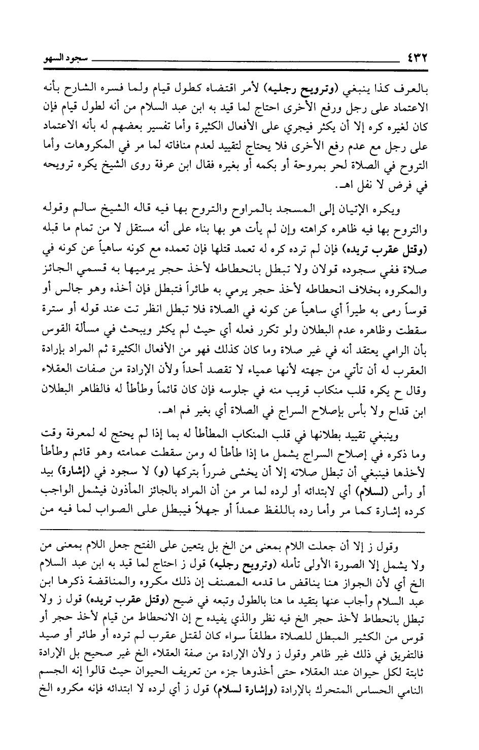 وقول ز إلا أن جعلت اللام بمعنى من الخ بل يتعين على الفتح جعل اللام بمعنى من ولا يشمل إلا الصورة الأولى تأمله (وترويح رجليه) قول ز احتاج لما قيد به ابن عبد السلام الخ أي لأن الجواز هنا يناقض ما قدمه المصنف إن ذلك مكروه والمناقضة ذكرها ابن عبد السلام وأجاب عنها بتقيد ما هنا بالطول وتبعه في ضيح (وقتل عقرب تريده) قول ز ولا تبطل بانحطاط لأخذ حجر الخ فيه نظر والذي يفيده ح إن الانحطاط من قيام لأخذ حجر أو قوس من الكثير المبطل للصلاة مطلقًا سواء كان لقتل عقرب لم ترده أو طائر أو صيد فالتفريق في ذلك غير ظاهر وقول ز ولأن الإرادة من صفة العقلاء الخ غير صحيح بل الإرادة ثابتة لكل حيوان عند العقلاء حتى أخذوها جزء من تعريف الحيوان حيث قالوا إنه الجسم النامي الحساس المتحرك بالإرادة (وإشارة لسلام) قول ز أي لرده لا ابتدائه فإنه مكروه الخ