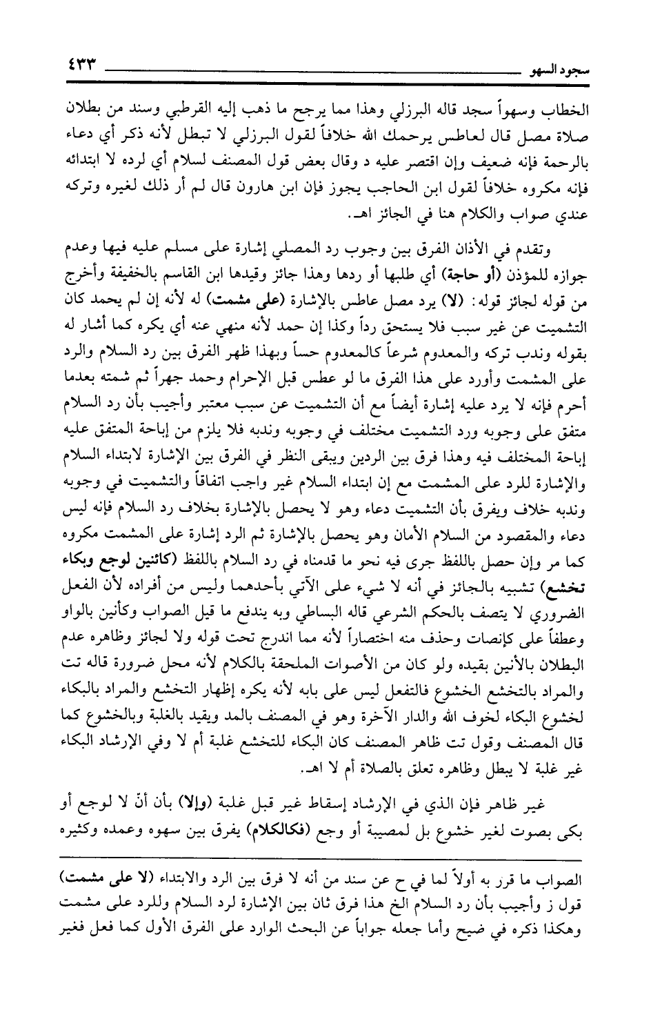 الخطاب وسهوًا سجد قاله البرزلي وهذا مما يرجح ما ذهب إليه القرطبي وسند من بطلان صلاة مصل قال لعاطس يرحمك الله خلافًا لقول البرزلي لا تبطل لأنه ذكر أي دعاء بالرحمة فإنه ضعيف وإن اقتصر عليه د وقال بعض قول المصنف لسلام أي لرده لا ابتدائه فإنه مكروه خلافًا لقول ابن الحاجب يجوز فإن ابن هارون قال لم أر ذلك لغيره وتركه عندي صواب والكلام هنا في الجائز اهـ.