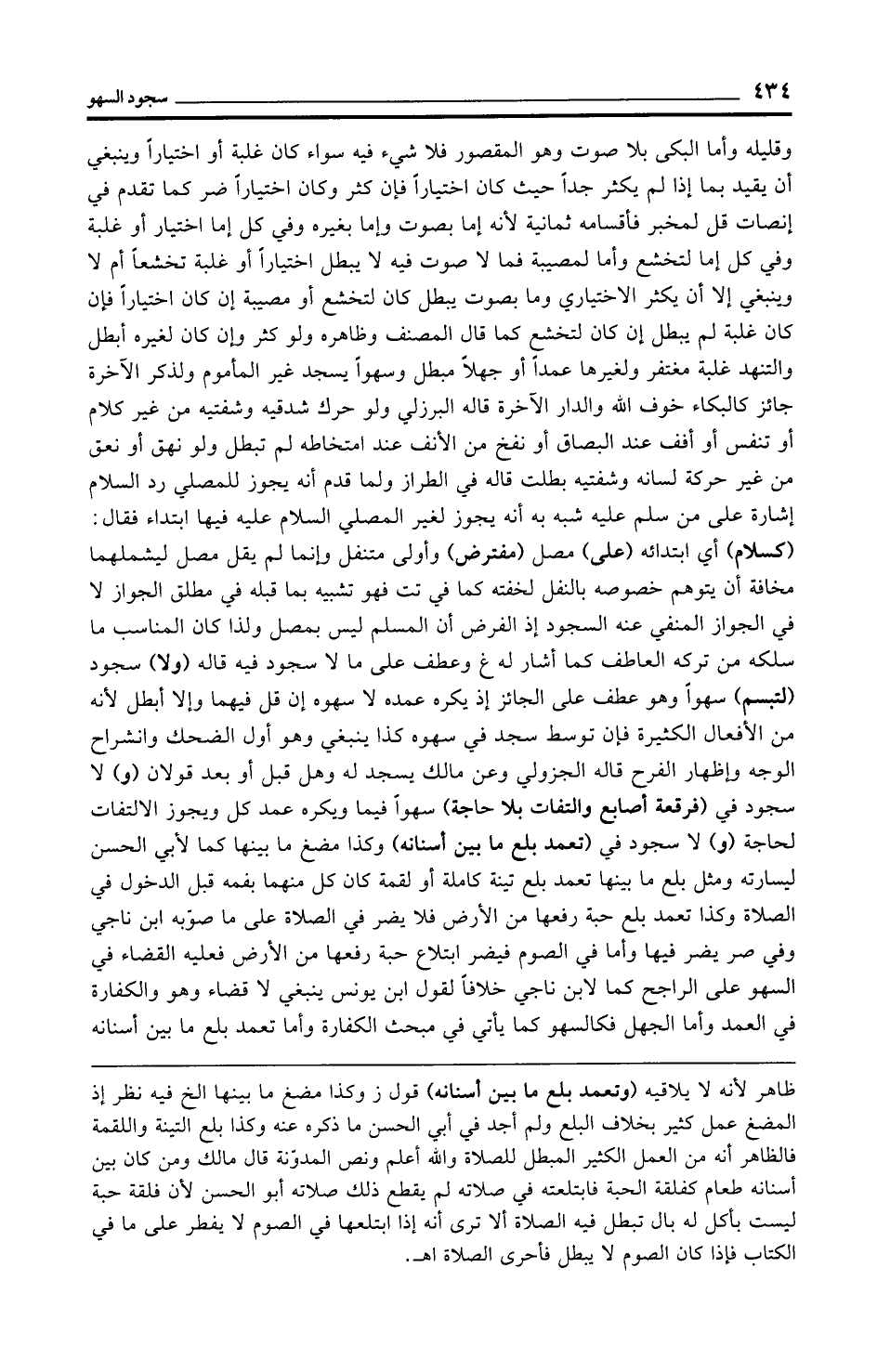 وقليله وأما البكى بلا صوت وهو المقصور فلا شيء فيه سواء كان غلبة أو اختيارًا وينبغي أن يقيد بما إذا لم يكثر جدًّا حيث كان اختيارًا فإن كثر وكان اختيارًا ضر كما تقدم في إنصات قل لمخبر فأقسامه ثمانية لأنه إما بصوت وإما بغيره وفي كل إما اختيار أو غلبة وفي كل إما لتخشع وأما لمصيبة فما لا صوت فيه لا يبطل اختيارًا أو غلبة تخشعًا أم لا وينبغي إلا أن يكثر الاختياري وما بصوت يبطل كان لتخشع أو مصيبة إن كان اختيارًا فإن كان غلبة لم يبطل إن كان لتخشع كما قال المصنف وظاهره ولو كثر وإن كان لغيره أبطل والتنهد غلبة مغتفر ولغيرها عمدًا أو جهلًا مبطل وسهوًا يسجد غير المأموم ولذكر الآخرة جائز كالبكاء خوف الله والدار الآخرة قاله البرزلي ولو حرك شدقيه وشفتيه من غير كلام أو تنفس أو أفف عند البصاق أو نفخ من الأنف عند امتخاطه لم تبطل ولو نهق أو نعق من غير حركة لسانه وشفتيه بطلت قاله في الطراز ولما قدم أنه يجوز للمصلي رد السلام إشارة على من سلم عليه شبه به أنه يجوز لغير المصلي السلام عليه فيها ابتداء فقال: (كسلام) أي ابتدائه (على) مصل (مفترض) وأولى متنفل وإنما لم يقل مصل ليشملهما مخافة أن يتوهم خصوصه بالنفل لخفته كما في تت فهو تشبيه بما قبله في مطلق الجواز لا في الجواز المنفي عنه السجود إذ الفرض أن المسلم ليس بمصل ولذا كان المناسب ما سلكه من تركه العاطف كما أشار له غ وعطف على ما لا سجود فيه قاله (ولا) سجود (لتبسم) سهوًا وهو عطف على الجائز إذ يكره عمده لا سهوه إن قل فيهما وإلا أبطل لأنه من الأفعال الكثيرة فإن توسط سجد في سهوه كذا ينبغي وهو أول الضحك وانشراح الوجه وإظهار الفرح قاله الجزولي وعن مالك يسجد له وهل قبل أو بعد قولان (و) لا سجود في (فرقعة أصابع والتفات بلا حاجة) سهوًا فيما ويكره عمد كل ويجوز الالتفات لحاجة (و) لا سجود في (تعمد بلع ما بين أسنانه) وكذا مضغ ما بينها كما لأبي الحسن ليسارته ومثل بلع ما بينها تعمد بلع تينة كاملة أو لقمة كان كل منهما بفمه قبل الدخول في الصلاة وكذا تعمد بلع حبة رفعها من الأرض فلا يضر في الصلاة على ما صوّبه ابن ناجي وفي صر يضر فيها وأما في الصوم فيضر ابتلاع حبة رفعها من الأرض فعليه القضاء في السهو على الراجح كما لابن ناجي خلافًا لقول ابن يونس ينبغي لا قضاء وهو والكفارة في العمد وأما الجهل فكالسهو كما يأتي في مبحث الكفارة وأما تعمد بلع ما بين أسنانه