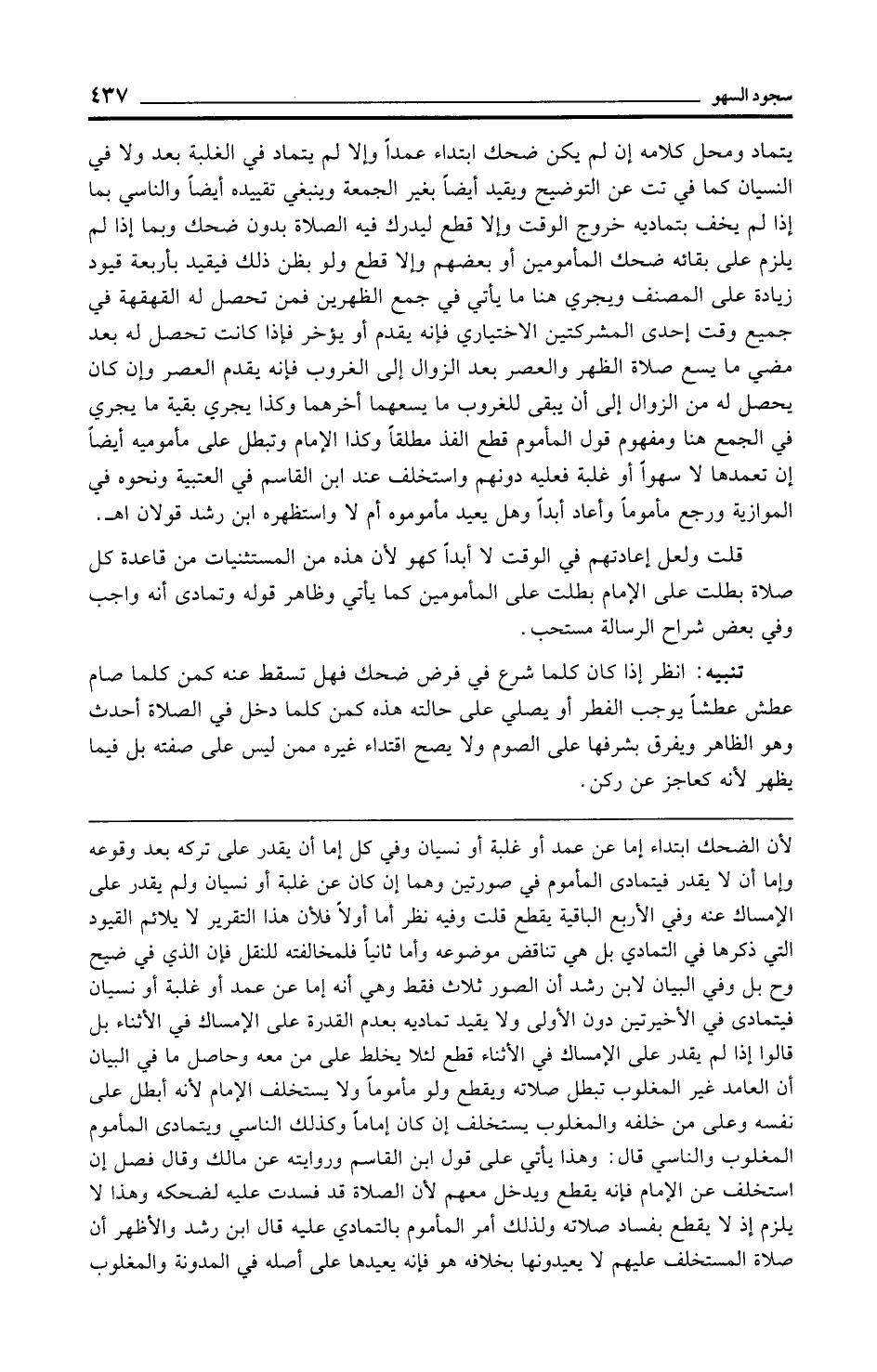 يتماد ومحل كلامه إن لم يكن ضحك ابتداء عمدًا وإلا لم يتماد في الغلبة بعد ولا في النسيان كما في تت عن التوضيح ويقيد أيضًا بغير الجمعة وينبغي تقييده أيضًا والناسي بما إذا لم يخف بتماديه خروج الوقت وإلا قطع ليدرك فيه الصلاة بدون ضحك وبما إذا لم يلزم على بقائه ضحك المأمومين أو بعضهم وإلا قطع ولو بظن ذلك فيقيد بأربعة قيود زيادة على المصنف ويجري هنا ما يأتي في جمع الظهرين فمن تحصل له القهقهة في جميع وقت إحدى المشركتين الاختياري فإنه يقدم أو يؤخر فإذا كانت تحصل له بعد مضي ما يسع صلاة الظهر والعصر بعد الزوال إلى الغروب فإنه يقدم العصر وإن كان يحصل له من الزوال إلى أن يبقى للغروب ما يسعهما أخرهما وكذا يجري بقية ما يجري في الجمع هنا ومفهوم قول المأموم قطع الفذ مطلقًا وكذا الإمام وتبطل على مأموميه أيضًا إن تعمدها لا سهوًا أو غلبة فعليه دونهم واستخلف عند ابن القاسم في العتبية ونحوه في الموازية ورجع مأمومًا وأعاد أبدًا وهل يعيد مأموموه أم لا واستظهره ابن رشد قولان اهـ.