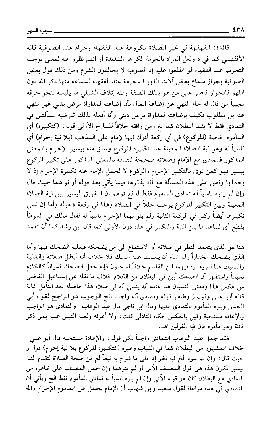 فائدة: القهقهة في غير الصلاة مكروهة عند الفقهاء وحرام عند الصوفية قاله الأقفهسي كما في د ولعل المراد بالحرمة الكراهة الشديدة أو أنهم نظروا فيه لمعنى يوجب التحريم عند الفقهاء لو اطلعوا عليه إذ الصوفية لا يخالفون الشرع ومن ذلك قول بعض الصوفية بجواز سماع بعض آلات اللهو المحرمة عند الفقهاء لسماعه منها ذكر الله دون اللهو فالجواز قاصر على من هو بتلك الصفة ومنه إتلاف الشبلي ما يلبسه بنحو حرقه مجيبًا من قال له جاء النهي عن إضاعة المال بأن إضاعته لمداواة مرض بدني غير منهي عنه بل مطلوب فكيف بإضاعته لمداواة مرض ديني وأنا أفعله لذلك ثم شبه مسألتين في التمادي فقط لا بقيد البطلان كما لغ ومن وافقه خلافًا للشارح الأولى قوله: (كتكبيره) أي المأموم خاصة (للركوع) في أي ركعة أدرك فيها لإمام على المذهب (بلا نية إحرام) أي ناسيًا له وهو نية الصلاة المعينة عند تكبيره للركوع وسبق منه بيسير الإحرام بالمعنى المذكور فيتمادى مع الإمام وصلاته صحيحة لتقدمه بالمعنى المذكور على تكبير الركوع بيسير فهو كمن نوى بالتكبير الإحرام والركوع لا لحمل الإمام عنه تكبيرة الإحرام إذ لا يحملها ونص على هذه المسألة مع أنه يذكرها فيما يأتي بعد قوله أو نواهما حيث قال وإن لم ينوه ناسيًا له تمادى المأموم فقط لدفع توهم أن التفريق اليسير بين نية الصلاة المعينة وبين التكبير للركوع يوجب خللًا في الصلاة وهذا في ركعة دخوله وأما إن نسي تكبيرها أيضًا وكبر في الركعة الثانية ولم ينو بهما الإحرام ناسيًا له فقال مالك في الموطأ يقطع أي لتباعد ما بين النية والتكبير في هذه دون الأولى كما قال ابن رشد كما أن تعمد