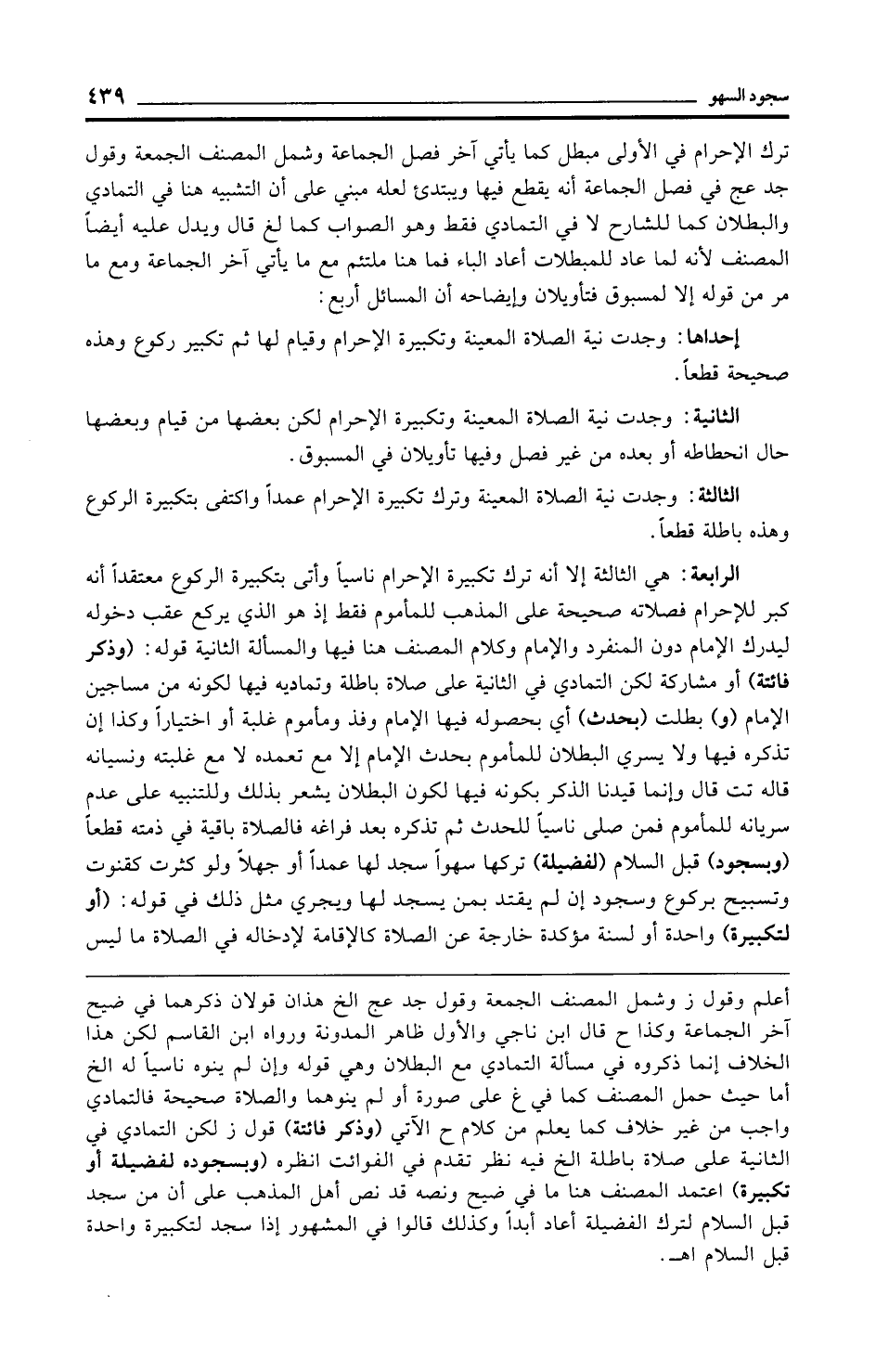 الرابعة: هي الثالثة إلا أنه ترك تكبيرة الإحرام ناسيًا وأتى بتكبيرة الركوع معتقدًا أنه كبر للإحرام فصلاته صحيحة على المذهب للمأموم فقط إذ هو الذي يركع عقب دخوله ليدرك الإمام دون المنفرد والإمام وكلام المصنف هنا فيها والمسألة الثانية قوله: (وذكر فائتة) أو مشاركة لكن التمادي في الثانية على صلاة باطلة وتماديه فيها لكونه من مساجين الإمام (و) بطلت (بحدث) أي بحصوله فيها الإمام وفذ ومأموم غلبة أو اختيارًا وكذا إن تذكره فيها ولا يسري البطلان للمأموم يحدث الإمام إلا مع تعمده لا مع غلبته ونسيانه قاله تت قال وإنما قيدنا الذكر بكونه فيها لكون البطلان يشعر بذلك وللتنبيه على عدم سريانه للمأموم فمن صلى ناسيًا للحديث ثم تذكره بعد فراغه فالصلاة باقية في ذمته قطعًا (وبسجود) قبل السلام (لفضيلة) تركها سهوًا سجد لها عمدًا أو جهلًا ولو كثرت كقنوت وتسبيح بركوع وسجود إن لم يقتد بمن يسجد لها ويجري مثل ذلك في قوله: (أو لتكبيرة) واحدة أو لسنة مؤكدة خارجة عن الصلاة كالإقامة لإدخاله في الصلاة ما ليس