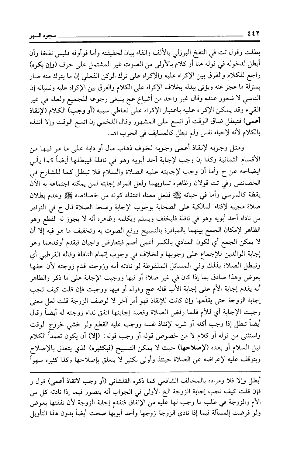بطلت وقول تت في النفخ البرزلي بالألف والفاء بيان لحقيقته وأما فوأوفه فليس نفخا وأن أبطل لدخوله في قوله هنا أو كلام بالأولى من الصوت غير المشتمل على حرف (وإن بكره) راجع للكلام والفرق بين الإكراه عليه والإكراه على ترك الركن الفعلي إن ما يترك منه صار بمنزلة ما عجز عنه ويؤتى ببدله بخلاف الإكراه على الكلام والفرق بين الإكراه عليه ونسيانه إن الناسي لا شعور عنده وقال غير واحد من أشياخ عج ينبغي رجوعه للجميع ولعله في غير القيء وقد يمكن الإكراه عليه باعتبار الإكراه على تعاطي سببه (أو وجب) الكلام (لإنقاذ أعمى) فتبطل ضاق الوقت أو اتسع على المشهور وقال اللخمي إن اتسع الوقت وإلا أنقذه بالكلام لأنه لإحياء نفس ولم تبطل كالمسايف في الحرب اهـ.