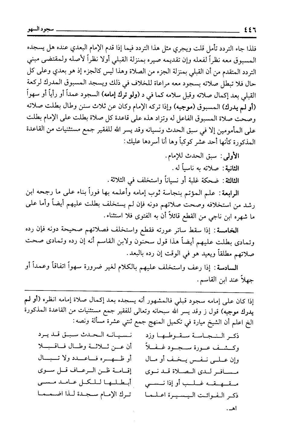 إذا كان على إمامه سجود قبلي فالمشهور أنه يسجده بعد إكمال صلاة إمامه انظره (أو لم يدرك موجبه) قول ز وقد يسر الله سبحانه وتعالى للفقير جمع مستثنيات من القاعدة المذكورة الخ اعلم أن الشيخ ميارة في تكميل المنهج جمع ثنتي عشرة مسألة ونصه: