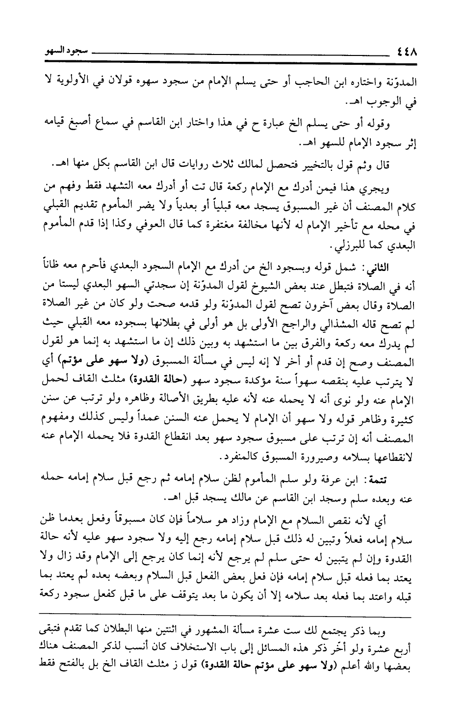 وبما ذكر يجتمع لك ست عشرة مسألة المشهور في اثنتين منها البطلان كما تقدم فتبقى أربع عشرة ولو أخّر ذكر هذه المسائل إلى باب الاستخلاف كان أنسب لذكر المصنف هناك بعضها والله أعلم (ولا سهو على مؤتم حالة القدوة) قول ز مثلث القاف الخ بل بالفتح فقط