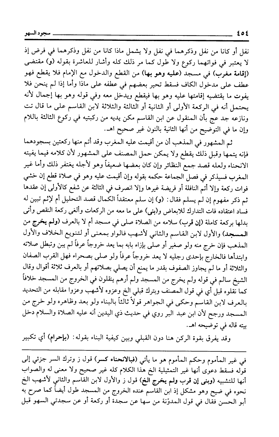في غير المأموم وحكم المأموم هو ما يأتي (فبالانحناء كسر) قول ز وترك السر جزئي إلى قوله فسقط دعوى أنها غير التمثيلية الخ هذا الكلام كله غير صحيح ولا معنى له والصواب أنها للتشبيه (وبنى إن قرب ولم يخرج الخ) قول ز والأول لابن القاسم والثاني لأشهب الخ نحوه في ضيح وهو مشكل إذ ابن القاسم عنده الخروج من المسجد طول أيضًا كما صرح به أبو الحسن فقال في قول المدوّنة من سها عن سجدة أو ركعة أو عن سجدتي السهو قبل