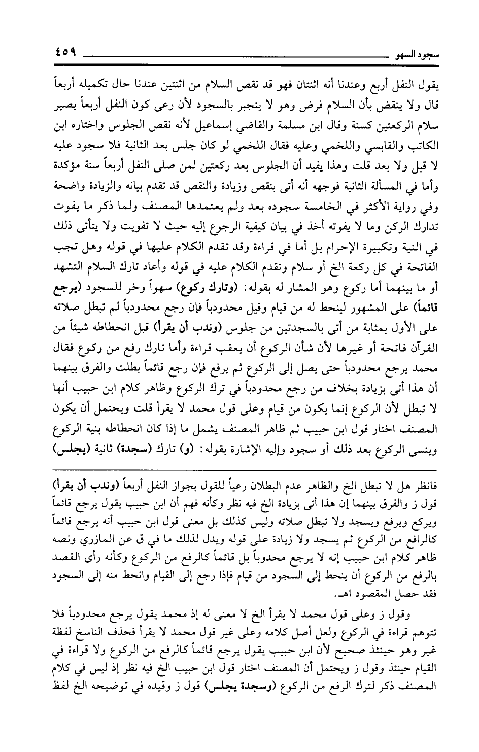 يقول النفل أربع وعندنا أنه اثنتان فهو قد نقص السلام من اثنتين عندنا حال تكميله أربعًا قال ولا ينقض بأن السلام فرض وهو لا ينجبر بالسجود لأن رعى كون النفل أربعًا يصير سلام الركعتين كسنة وقال ابن مسلمة والقاضي إسماعيل لأنه نقص الجلوس واختاره ابن الكاتب والقابسي واللخمي وعليه فقال اللخمي لو كان جلس بعد الثانية فلا سجود عليه لا قبل ولا بعد قلت وهذا يفيد أن الجلوس بعد ركعتين لمن صلى النفل أربعًا سنة مؤكدة وأما في المسألة الثانية فوجهه أنه أتى بنقص وزيادة والنقص قد تقدم بيانه والزيادة واضحة وفي رواية الأكثر في الخامسة سجوده بعد ولم يعتمدها المصنف ولما ذكر ما يفوت تدارك الركن وما لا يفوته أخذ في بيان كيفية الرجوع إليه حيث لا تفويت ولا يتأتى ذلك في النية وتكبيرة الإحرام بل أما في قراءة وقد تقدم الكلام عليها في قوله وهل تجب الفاتحة في كل ركعة الخ أو سلام وتقدم الكلام عليه في قوله وأعاد تارك السلام التشهد أو ما بينهما أما ركوع وهو المشار له بقوله: (وتارك ركوع) سهوًا وخر للسجود (يرجع قائمًا) على المشهور لينحط له من قيام وقيل محدودبًا فإن رجع محدودبًا لم تبطل صلاته على الأول بمثابة من أتى بالسجدتين من جلوس (وندب أن يقرأ) قبل انحطاطه شيئًا من القرآن فاتحة أو غيرها لأن شأن الركوع أن يعقب قراءة وأما تارك رفع من ركوع فقال محمد يرجع محدودبًا حتى يصل إلى الركوع ثم يرفع فإن رجع قائمًا بطلت والفرق بينهما أن هذا أتى بزيادة بخلاف من رجع محدودبًا في ترك الركوع وظاهر كلام ابن حبيب أنها لا تبطل لأن الركوع إنما يكون من قيام وعلى قول محمد لا يقرأ قلت ويحتمل أن يكون المصنف اختار قول ابن حبيب ثم ظاهر المصنف يشمل ما إذا كان انحطاطه بنية الركوع وينسى الركوع بعد ذلك أو سجود وإليه الإشارة بقوله: (و) تارك (سجدة) ثانية (يجلس)