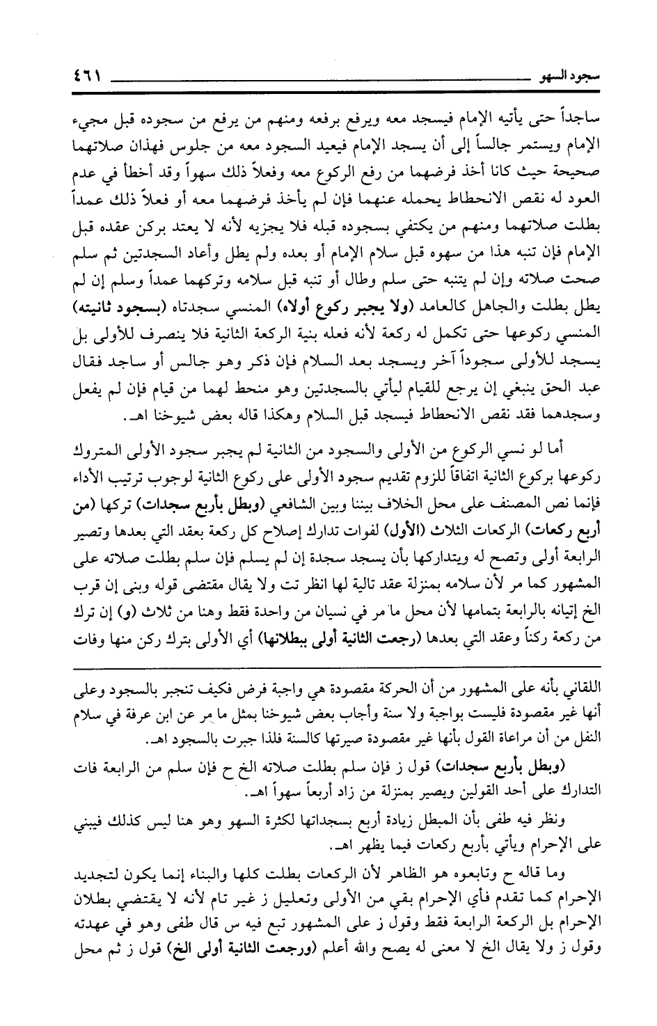ساجدًا حتى يأتيه الإمام فيسجد معه ويرفع برفعه ومنهم من يرفع من سجوده قبل مجيء الإمام ويستمر جالسًا إلى أن يسجد الإمام فيعيد السجود معه من جلوس فهذان صلاتهما صحيحة حيث كانا أخذ فرضهما من رفع الركوع معه وفعلًا ذلك سهوًا وقد أخطأ في عدم العود له نقص الانحطاط يحمله عنهما فإن لم يأخذ فرضهما معه أو فعلًا ذلك عمدًا بطلت صلاتهما ومنهم من يكتفي بسجوده قبله فلا يجزيه لأنه لا يعتد بركن عقده قبل الإمام فإن تنبه هذا من سهوه قبل سلام الإمام أو بعده ولم يطل وأعاد السجدتين ثم سلم صحت صلاته وإن لم يتنبه حتى سلم وطال أو تنبه قبل سلامه وتركهما عمدًا وسلم إن لم يطل بطلت والجاهل كالعامد (ولا يجبر ركوع أولاه) المنسي سجدتاه (بسجود ثانيته) المنسي ركوعها حتى تكمل له ركعة لأنه فعله بنية الركعة الثانية فلا ينصرف للأولى بل يسجد للأولى سجودًا آخر ويسجد بعد السلام فإن ذكر وهو جالس أو ساجد فقال عبد الحق ينبغي إن يرجع للقيام ليأتي بالسجدتين وهو منحط لهما من قيام فإن لم يفعل وسجدهما فقد نقص الانحطاط فيسجد قبل السلام وهكذا قاله بعض شيوخنا اهـ.