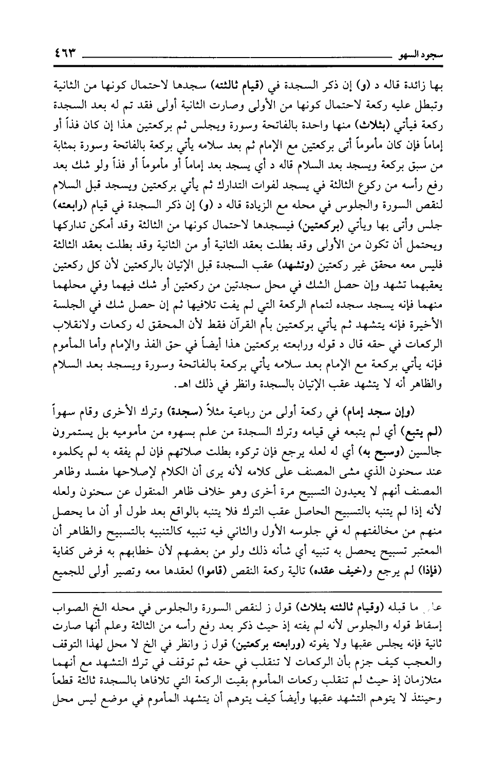 (وإن سجد إمام) في ركعة أولى من رباعية مثلًا (سجدة) وترك الأخرى وقام سهوًا (لم يتبع) أي لم يتبعه في قيامه وترك السجدة من علم بسهوه من مأموميه بل يستمرون جالسين (وسبح به) أي له لعله يرجع فإن تركوه بطلت صلاتهم فإن لم يفقه به لم يكلموه عند سحنون الذي مشى المصنف على كلامه لأنه يرى أن الكلام لإصلاحها مفسد وظاهر المصنف أنهم لا يعيدون التسبيح مرة أخرى وهو خلاف ظاهر المنقول عن سحنون ولعله لأنه إذا لم يتنبه بالتسبيح الحاصل عقب الترك فلا يتنبه بالواقع بعد طول أو أن ما يحصل منهم من مخالفتهم له في جلوسه الأول والثاني فيه تنبيه كالتنبيه بالتسبيح والظاهر أن المعتبر تسبيح يحصل به تنبيه أي شأنه ذلك ولو من بعضهم لأن خطابهم به فرض كفاية (فإذا) لم يرجع و (خيف عقده) تالية ركعة النقص (قاموا) لعقدها معه وتصير أولى للجميع